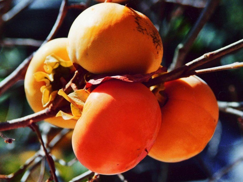 Kaki 'Chioccolatino' - eine selbstfruchtbare Kaki-Sorte aus Italien, die sich nicht nur durch ihren Geschmack, sondern auch durch das dekorative Aussehen ihrer Früchte und des Baumes auszeichnet. Die Früchte sind mittelgroß bis groß, mit glatter, gelb-oranger Schale und typischem bronzefarben-orangem Fruchtfleisch, das bei reifen Früchten zart, saftig und ausgeprägt süß ist. Reife Früchte sind für den direkten Verzehr bestimmt – das Fruchtfleisch ist nicht herb, die Schale kann vor dem Verzehr geschält werden, es ist aber nicht notwendig. Die Früchte reifen im Oktober, oft nach dem Blattfall, wenn die Früchte an den Zweigen verbleiben und sehr dekorativ wirken. Neben dem sofortigen Verzehr nach der Ernte können reife Früchte bis zu zwei Monate kühl (bei ca. 0 °C) gelagert werden, was ihre Nutzbarkeit verlängert. Der Baum erreicht eine Höhe von etwa 3,5 bis 4 Metern und hat ein mittelstarkes, verzweigtes Wachstum. Die Sorte ist ein guter Bestäuber für andere Kakis, obwohl sie selbst keine Bestäubung für die Fruchtbildung benötigt.