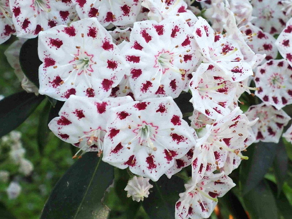 Kalmia 'Ring Dance' - Die Sorte 'Ring Dance' stammt aus der Züchtung von Karl Heinz Hübbers, wurde durch Kreuzung der Sorten 'Vanilla Cream' und 'Radiata' gewonnen und 2021 registriert. Sie gehört zu den kompakteren Formen mit aufrechtem bis leicht ausladendem Habitus. Unter Gartenbedingungen erreicht sie eine Höhe von etwa 1,2–1,5 m und eine ähnliche Breite, in den ersten zehn Jahren ist sie in der Regel niedriger. Sie bildet einen dichten, gut verzweigten Strauch mit kräftigen, aufrechten Trieben. Die Blätter sind ledrig, elliptisch bis lanzettlich, etwa 5–10 cm lang, tief dunkelgrün und glänzend, verbleiben das ganze Jahr über an der Pflanze und verleihen der Pflanzung auch im Winter eine beständige Struktur. An den Triebspitzen erscheinen Ende Mai und im Juni breite, endständige Blütenstände, die aus Dutzenden relativ großer Blüten mit einem Durchmesser von bis zu 3 cm bestehen. Die mattweiße bis weißliche Knospe öffnet sich allmählich zu einer flachen, schalenförmigen Blüte. Die Grundfarbe ist weiß, am Rand der Krone wiederholt sich ein ausgeprägtes rotes Muster in Form von kleinen, fast quadratischen Flecken, die einen auffälligen „Ring“ um die Blüte bilden. Die zweifarbige Zeichnung der Blüten hebt sich deutlich vom dunklen Laub ab und schließt an die Frühlingsblüte von Rhododendren und Azaleen an, wodurch die Attraktivität von Heidegärten und säureliebenden Beeten bis in den Frühsommer hinein verlängert wird. 'Ring Dance' eignet sich als kleine Solitärpflanze an der Terrasse, im Vorgarten sowie in Gruppen mit Rhododendren, Heidekraut, Farnen und schattenliebenden Gräsern, ist aber auch für größere Gefäße im Halbschatten geeignet. Wie alle Kalmien gehört sie zu den giftigen Ziersträuchern – alle Teile der Pflanze enthalten giftige Substanzen und sind bei Verzehr für Mensch und Haustier gefährlich.