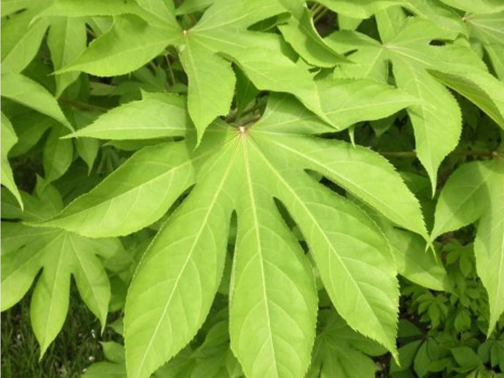 Siebenlappiger Straucharalie - bei uns wird er meist als Strauch oder mehrstämmiger Baum kultiviert. In seiner Heimat wird er als Baum kultiviert und erreicht eine Höhe von bis zu 30 m. Die Äste sind dick mit starken, kegelförmigen Dornen. Die Rinde ist grau. Die Krone ist rundlich bis kugelförmig, hell und offen. Die Blätter sind fast rundlich, breit und 5-9-lappig. Sie haben eine dunkelgrüne Farbe, auf der Unterseite sind sie etwas heller gefärbt. Die Blüten sind weiß bis gelblich-grün, in Rispen angeordnet, die bis zu 20 cm lang sind und im Juli erscheinen. Nach den Blüten folgen die Früchte, die kugelförmig sind. Unter unseren Bedingungen erreicht er eine Höhe von etwa 5 m.