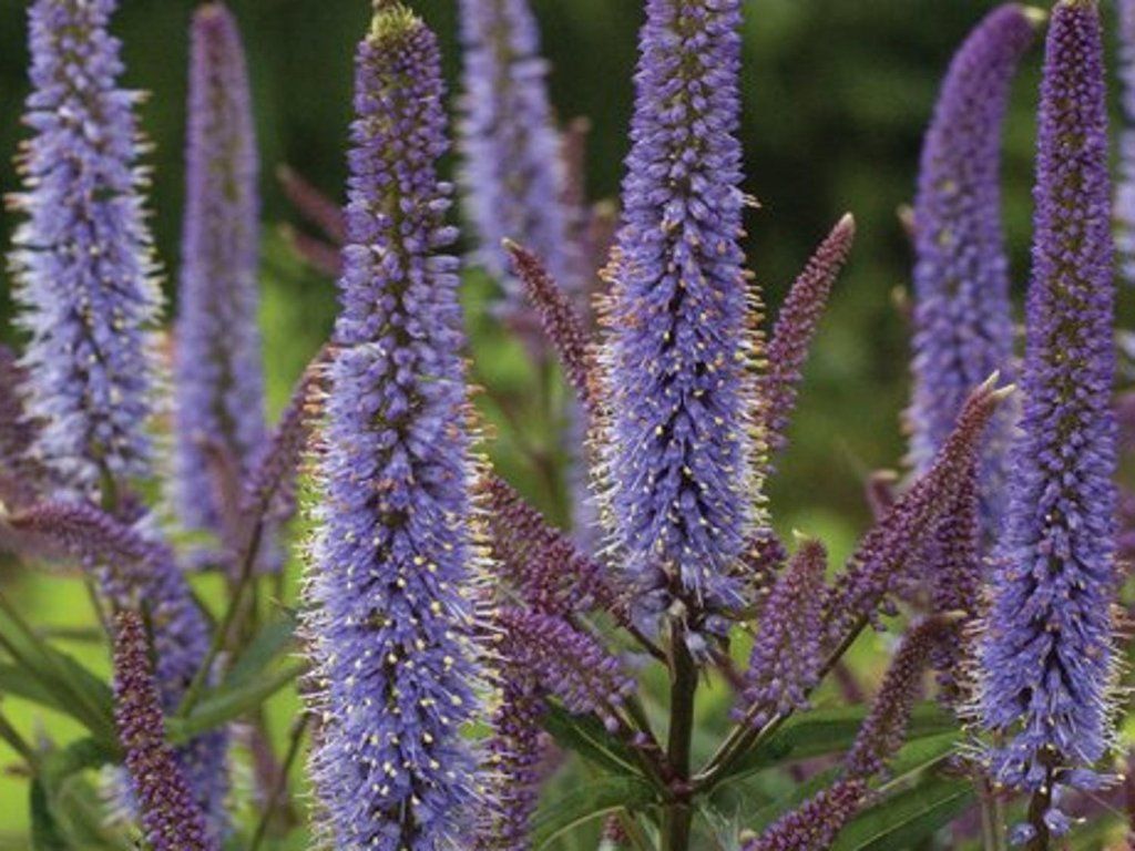 Veronicastrum virginicum 'Red Arrows' - Staude, die je nach Kulturbedingungen eine Höhe von 120 - 150 cm und eine Breite von etwa 50 - 100 cm erreicht. Die Blätter sind gegenständig, lanzettlich und mittel- bis dunkelgrün und wachsen an kräftigen Stielen. Die Pflanze blüht im Juni und Juli in Form eines ährenförmigen Blütenstandes. Dieser besteht aus hellvioletten Blüten, die sehr angenehm duften. Kommt in Kombination mit kleineren und nicht blühenden Sträuchern zur Geltung. Oder klassisch im Staudenbeet.