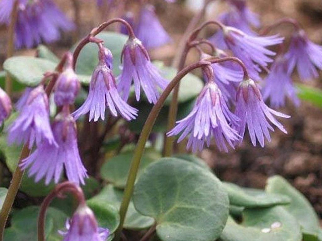 Karpaten-Steinbrech - Sehr beliebte Steingartenpflanze, die bis zu 10 cm hoch wird. Die Blätter sind grün, aber auf der Unterseite rötlich, nierenförmig und wirken dekorativ. Die Blätter bilden eine grundständige Rosette. Die Blüten sind klein und blauviolett, glockenförmig. Blüht von März bis April. Die Frucht ist eine eiförmige Kapsel.