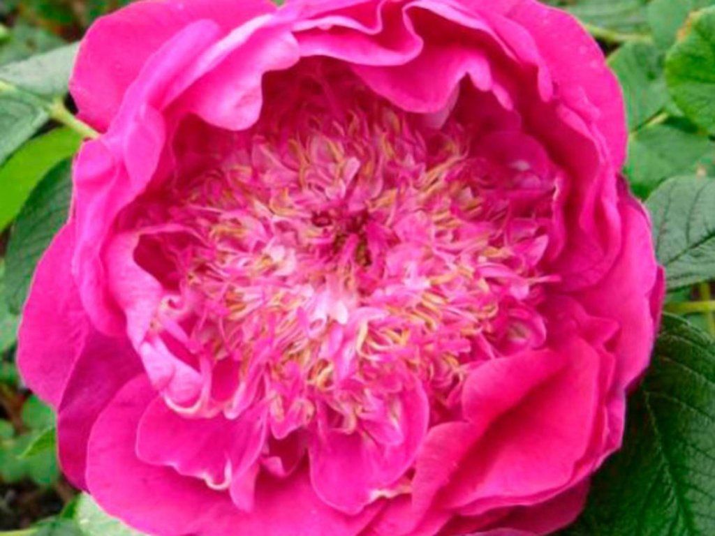 Runzelrose 'Pompon Perfume' - attraktiver Kultivar mit ungewöhnlichen Blüten, die an Pfingstrosenblüten erinnern. Der Strauch erreicht eine Höhe und Breite von ca. 1,5 m. Die Blüten sind größer, voll, in einem satten Pinkton, mit einer reichen Menge an gewellten, gerüschten Blütenblättern. Ihr Duft ist sehr angenehm. Sie blühen von Juni bis Oktober. Im Herbst werden sie durch rot gefärbte Früchte ersetzt. Die Blätter sind kleiner, grün und im Herbst schön goldgelb. Ein wahres Schmuckstück für jeden Garten.