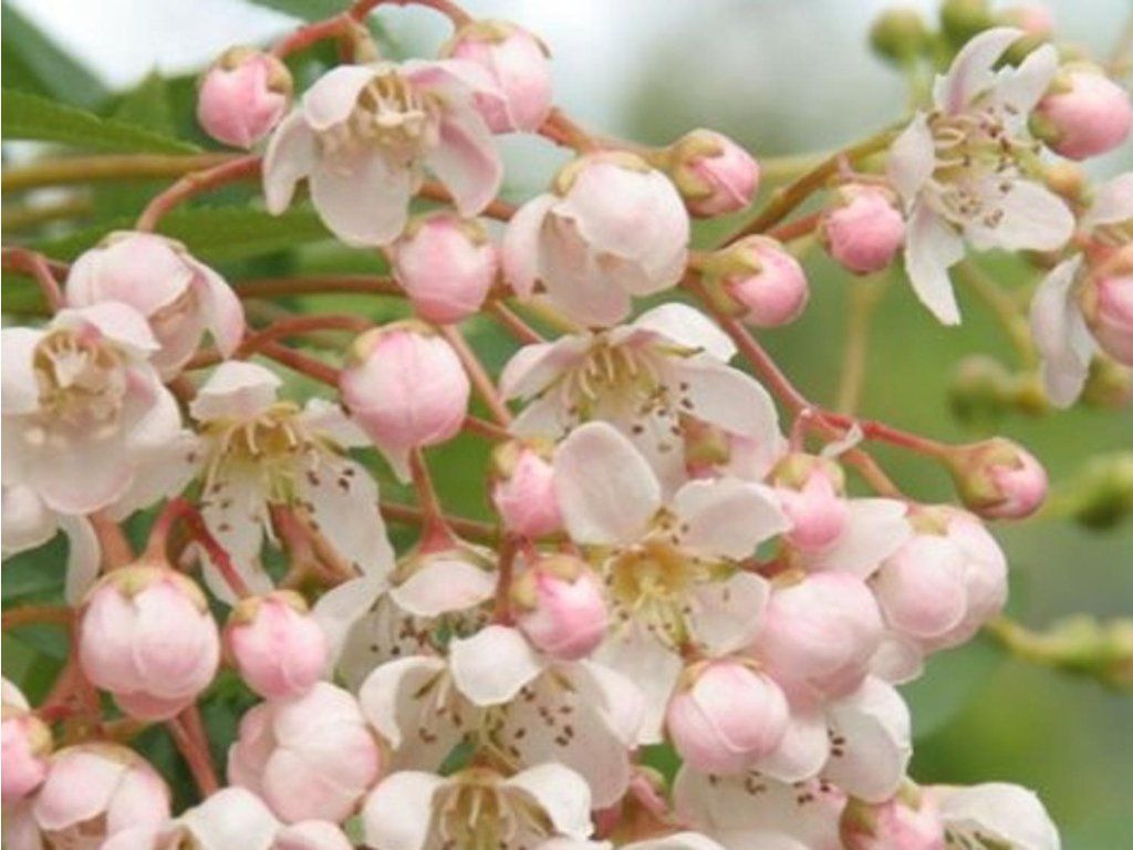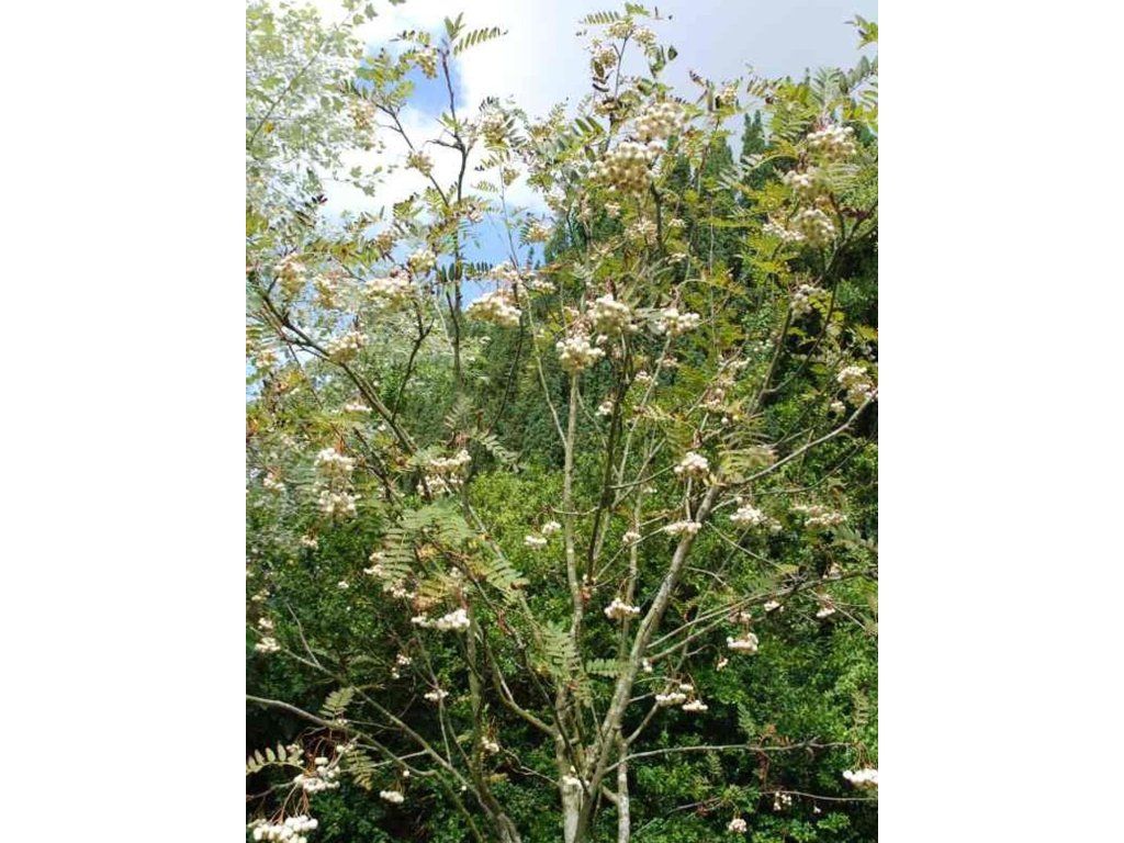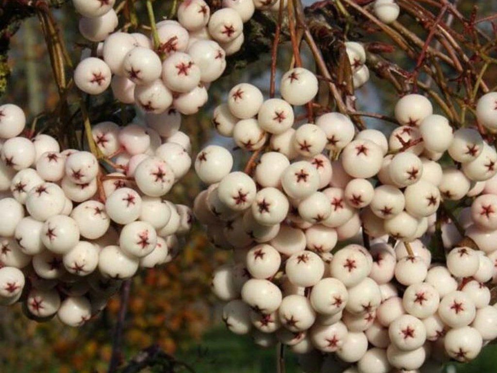 Sorbus lanata - ziert dunkelgrüne, fein filzige, unpaarig gefiederte Blätter, deren Herbstfarbe von goldgelb über verschiedene Rottöne bis hin zu Weinrot wechselt. Die Blütenstände sind reiche Rispen, die aus kleinen weiß-rosa Blüten bestehen. Im August verwandeln sich die Blüten in weiß gefärbte Früchte, die noch lange nach dem Laubfall am Baum verbleiben. Er wächst langsam bis mäßig schnell und hat kräftige Zweige, die dem Baum Eleganz verleihen, da sie eine relativ symmetrische, zylindrische Krone bilden. Er wächst zu einem Baum von etwa 5-6 m Höhe heran.