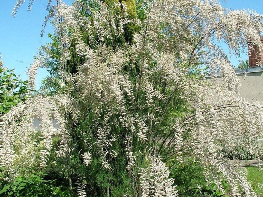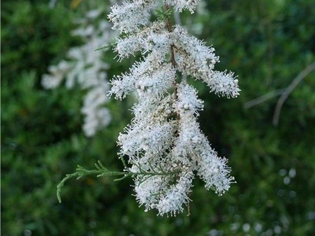 Tamarix ramosissima 'Hulsdonk White' - laubabwerfender Strauch oder kleiner Baum. Strauch oder kleiner Baum. Die Zweige sind gewölbt rotbraun. Erreicht eine Höhe von ca. 4 m und eine Breite von ca. 2 - 3 m. Das Wachstum ist frei ausladend und die Zuwächse können sogar leichte Überhänge bilden. Er hat schmale, schuppige Blätter von hellgrüner bis graugrüner Farbe. Die Blättchen ähneln eher Nadeln. Von Juli bis September blüht er mit weißen Blüten, die in Rispen angeordnet sind. Ideal als Solitärpflanze im Garten oder zur Auflockerung der Gartengestaltung.