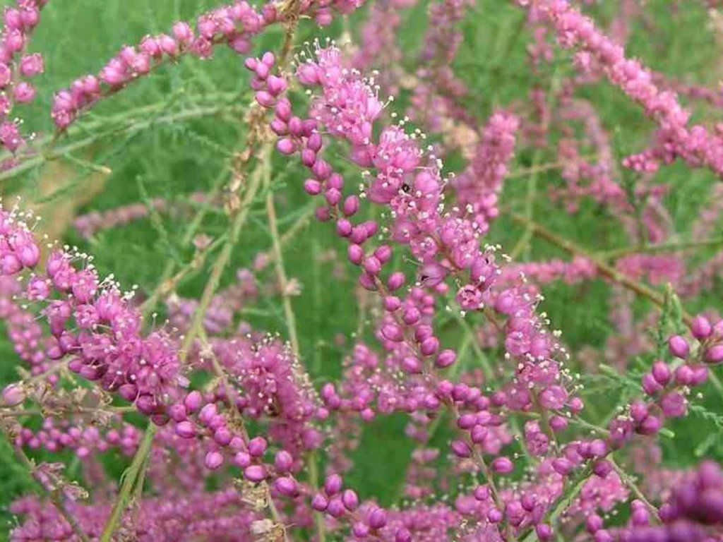Kaspische Tamariske - ein größerer, laubabwerfender Strauch, der eine Höhe von 3 - 4,5 m und eine Breite von 2,4 - 3,9 m erreicht. Der Habitus ist ausgebreitet und offen. Die Äste haben eine rötliche Farbe und sind leicht gewölbt. Die Blätter sind sehr schmal, blaugrün, schuppig und spiralig an den Zweigen angeordnet. An den Spitzen der Äste bilden sich vom Spätsommer bis zum Frühherbst reiche Rispen von rosa Blüten, die in langen Trauben angeordnet sind. Sie verbleiben 4-6 Wochen am Strauch. Danach werden sie durch Samenkapseln ersetzt.