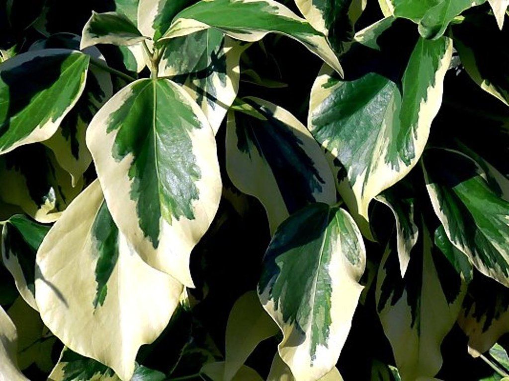 Kaukasische Efeu 'Dentata Variegata' - die Sorte 'Dentata Variegata' ist eine großblättrige, panaschierte Form mit herzförmigen, ledrigen Blättern, die normalerweise 10–12 cm breit sind, hellgrün mit einem unregelmäßigen cremeweißen Rand. Die Triebe haften mit Haftwurzeln und erreichen an einer Stütze eine Höhe von ca. 4–8 m, wobei sich der Bewuchs üblicherweise auf 2–4 m ausbreitet. Bei Anbau ohne Stütze breiten sie sich in die Breite aus und wurzeln an den Knoten. Im Herbst, meist im September und Oktober, erscheinen an den erwachsenen Trieben kugelförmige Blütenstände aus kleinen grünlich-weißen Blüten, die von Bienen gesucht werden, wenn die meisten Gehölze nicht mehr blühen. Es folgen dunkle Beeren, die etwa von Oktober bis Dezember reifen und für Menschen und Haustiere giftig sind. Im Garten eignet er sich als immergrüne Verkleidung von Mauern und Zäunen, zur Kaschierung unansehnlicher Stellen und als Bodendecker für den Halbschatten, er harmoniert gut mit Farnen, Funkien, Brunneras und Frühlingszwiebelblumen. Blühende Triebe tragen eher ganzrandige Blätter, während sterile, kletternde Triebe fein gelappt sein können, wodurch der Bewuchs natürlich plastisch wirkt. Die Panaschierung ist am reinsten an Trieben mit ausreichend gestreutem Licht und bleibt auch im Winter ohne Blüten dekorativ.