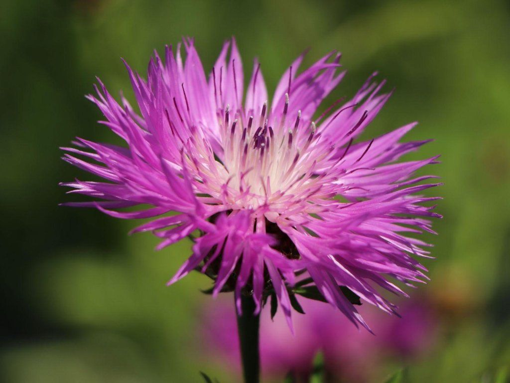 Berg-Flockenblume 'Steenbergii' - Beliebte Beetstauden, werden aber auch als einjährige Pflanzen angebaut. Wächst auch wild auf Wiesen und Feldern. Die klassische Farbe, die Kornblumen symbolisiert, ist Blau. Züchter haben jedoch Sorten gezüchtet, die die verschiedensten Farben von Weiß bis Braun tragen. Der Blütenstand ähnelt einer Distel und besteht aus vielen kleinen röhrenförmigen Blüten. Sie ziehen Schmetterlinge und Bienen an. Diese Art blüht von Juni bis August mit dunkelvioletten Blüten mit gelber Mitte. Sie erreicht eine Höhe von etwa 100 cm und benötigt beim Wachstum eine Stütze. Dunkelgrüne Blätter wachsen in einer grundständigen Rosette und sind gestielt. Die Stängel sind fein behaart.