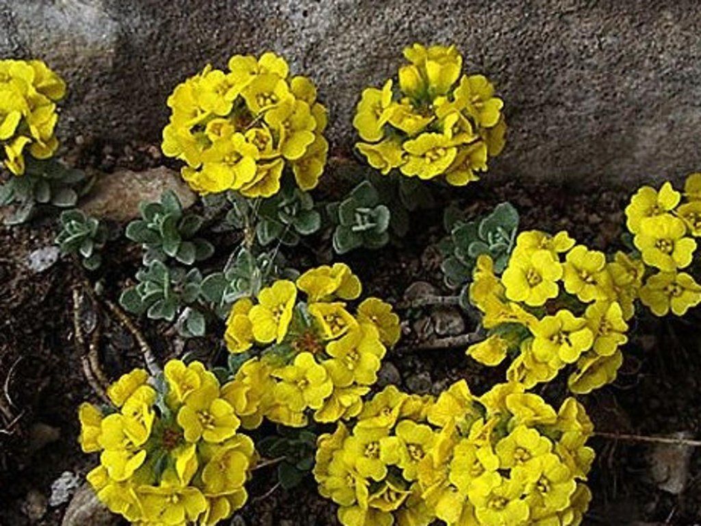 Steinkraut - eine niedrige, ausdauernde, anspruchslose Pflanze, die sich durch ihre früh im Frühling blühenden Büschel leuchtend gelber Blüten auszeichnet. Sie ist eine sehr widerstandsfähige Staude. Sie bildet niedrige Polster aus graugrünen Blättern. Sie erreicht eine Höhe von 5 cm. Sie blüht von April bis Mai. Sie wird oft in verschiedenen Varietäten auch in Steingärten gepflanzt. Sie benötigt sonnige Standorte. Sie ist frostbeständig bis -18 °C. Sehr widerstandsfähige, trockenheitsliebende Steingartenpflanze, die sich zur Bepflanzung von Steinmauern oder Fugen zwischen Steinen eignet. Sie bildet niedrige Polster aus graugrünen Blättern. Kann zusammen mit Iberis, Draba, Saxifraga, Campanula carpatica, Festuca (Festuca glauca, F.scoparia) usw. gepflanzt werden. Benötigt volle Sonne. Höhe: 5 cm, Blütenfarbe: leuchtend gelb, Blütezeit: April, Mai, Zierblatt: graugrüne, bereifte Blätter, Lichtbedarf: Sonne, Standort: MK1,SF1,FS1,St1,trockener, gut durchlässiger Boden, Temperaturzone: Z7 -18 bis -12 °C