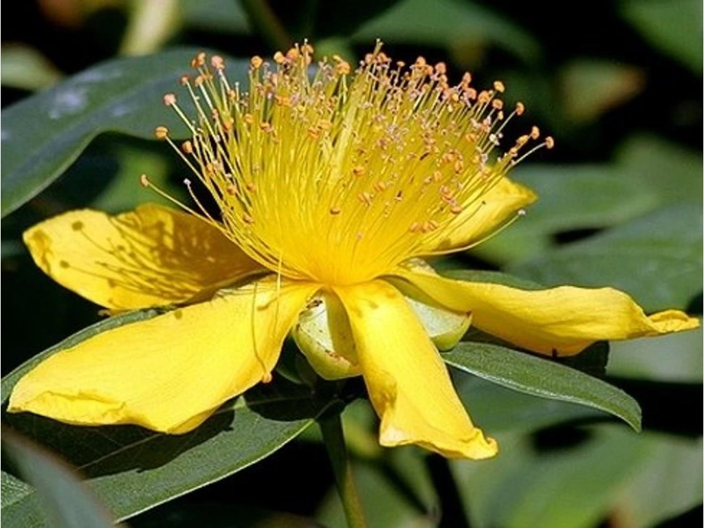 Kelch-Johanniskraut – ein niedriger, kriechender Halbstrauch, der ursprünglich aus Südosteuropa und angrenzenden Teilen Kleinasiens stammt und in Gärten als heller Bodendecker geschätzt wird. Ausgewachsen erreicht er eine Höhe von etwa 0,3–0,4 m und eine Breite von 0,8–1,2 m. Da er sich durch unterirdische Ausläufer ausbreitet, füllt er schnell die Bodenoberfläche aus. Die Blätter sind gegenständig, oval, 4–8 cm lang, bleiben im Winter normalerweise erhalten und können sich bei Kälte zu bronzefarbenen bis purpurnen Tönen verfärben. Von Juni bis August öffnen sich an den Triebspitzen allmählich einzelne gelbe Blüten von 5–7 cm, mit einem Kranz von Staubgefäßen, die Bestäuber anlocken. Nach der Blüte können sich kleine Samenkapseln bilden, aber der Ziereffekt liegt hauptsächlich in der Kombination aus glänzendem Laub und großen, schalenförmigen Blüten. In der Komposition fügt sie sich gut zu Ziergräsern, Salbei, Lavendel und niedrigen Spiersträuchern, eignet sich auch gut als Wegbegrenzung oder Hangbepflanzung, wo sie hilft, den Boden zu befestigen und Unkraut zu unterdrücken. Das Ausbreiten durch unterirdische Ausläufer ist vorteilhaft für eine schnelle Bedeckung, in kleinen Beeten wird sie manchmal durch eine Einfassung begrenzt. Die Pflanze ist nicht dornig, aber der Saft kann bei Einnahme Verdauungsbeschwerden verursachen, daher wird in Gärten mit kleinen Kindern eher die Zierpflanzenverwendung bevorzugt.