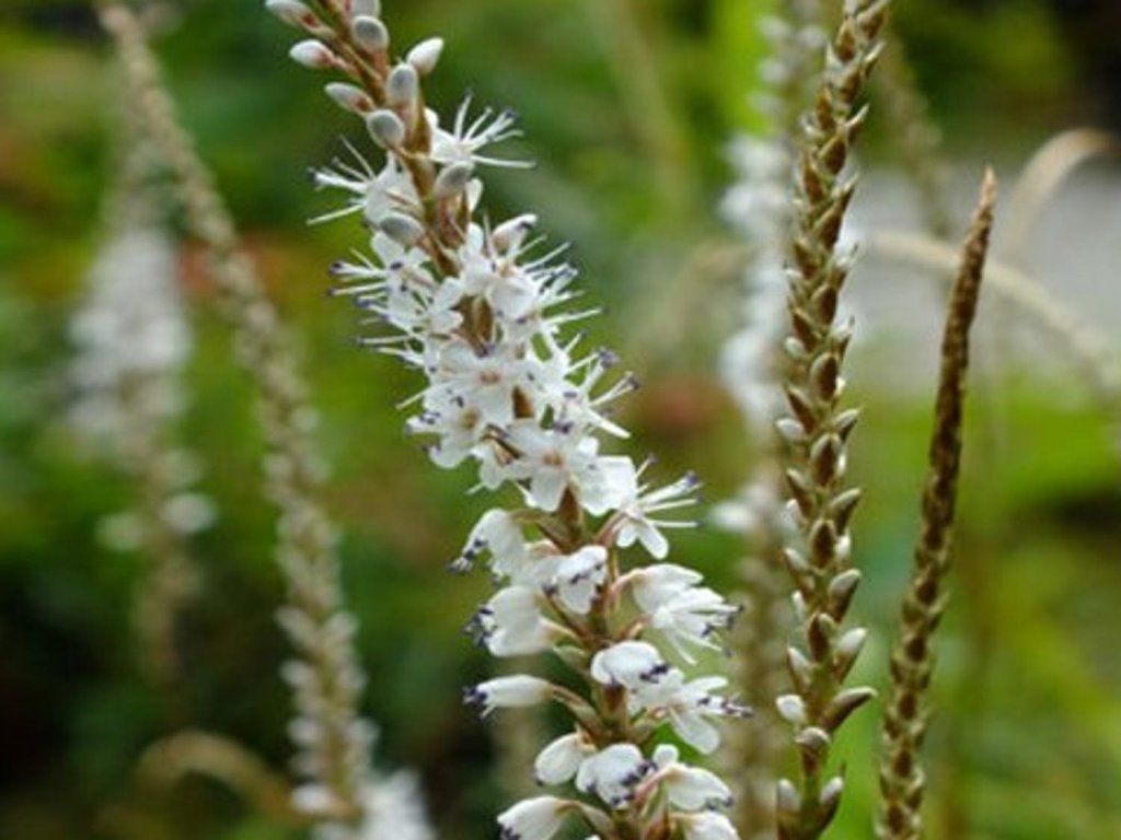 Kerzen-Knöterich 'Alba' - syn. Polygonum amplexicaule, manchmal auch Bistorta amplexicaulis. Sie stammt aus dem Himalaya und dem südwestlichen China, wo sie auf Bergwiesen und entlang von Bächen gedeiht. Die Sorte 'Alba' zeichnet sich durch reinweiße Blütenstände und einen ruhigen, ordentlichen Wuchs aus. Sie bildet einen dichten Horst aus kurzen Rhizomen mit einer Grundmasse aus großen, spitz zulaufenden, ovalen bis herzförmigen Blättern, die in der Regel 15–25 cm lang sind. Die Blätter sind in der Saison mittelgrün, im Herbst können sie stellenweise bronzefarben bis rötlich werden. Ausgewachsen ist die Pflanze etwa 0,9–1,2 m hoch und 0,8–1,2 m breit. Von Juli bis Oktober wachsen über den Blättern schlanke, aufrechte Blütenstände, oft 10–20 cm lang, die aus winzigen weißen Blüten bestehen. Der Duft ist meist unauffällig. Die Blütenstängel behalten auch nach Regen ihre Form und bilden leuchtende „Kerzen“ im Blumenbeet, die sich gut mit Ziergräsern, Indianernesseln, Sonnenhüten oder dunkelblättrigen Gehölzen kombinieren lassen. Bienen und andere nützliche Insekten suchen die Blüten auf. Nachdem sich die Pflanzung geschlossen hat, beschattet die Blattmasse den Boden gut und reduziert Unkraut, daher eignet sie sich auch für größere Gruppen.