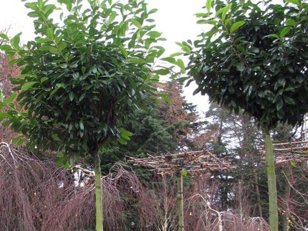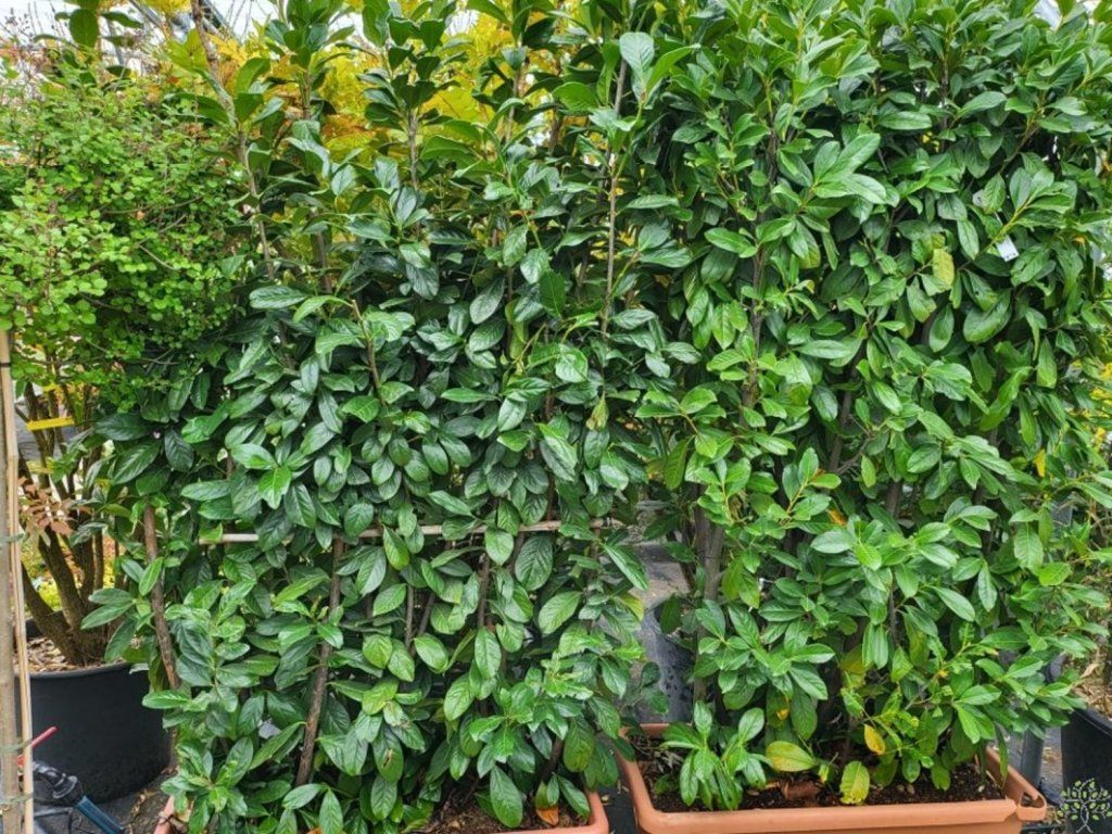 Anbau: Kirschlorbeeren bevorzugen sonnige bis halbschattige Standorte. Direkte Mittagssonne kann für junge Pflanzen zu intensiv sein, daher ist ein leichter Schatten ratsam. Sie benötigen gut durchlässigen, leicht sauren bis neutralen Boden (pH 6–7). Sie bevorzugen keine schweren lehmigen Böden, wo Staunässe an den Wurzeln droht. Optimal ist leichter Lehmboden mit Zusatz von Kompost oder Sand zur Verbesserung der Drainage. In Kübeln wird eine hochwertige Gartenerde gemischt mit Perlit oder Sand empfohlen. Sie mögen regelmäßige Bewässerung, besonders in den ersten Jahren nach der Pflanzung. Der Boden sollte feucht, aber nicht staunass sein. Im Frühling und Sommer wird eine Düngung einmal pro Monat mit einem ausgewogenen Flüssigdünger für Immergrüne empfohlen. In Behältern ist es ratsam, während der Vegetationsperiode auch einen leicht sauren Dünger, z.B. für Rhododendren, hinzuzufügen, um eine gesunde grüne Blattfarbe zu fördern. Sie vertragen Schnitt und Formschnitt gut, was ein dichtes Wachstum fördert. Die beste Zeit für einen leichten Formschnitt ist das Frühjahr, nach den letzten Frösten. Für eine Hecke kann während der Vegetationsperiode geschnitten werden, um eine kompakte Form zu erhalten. Für einzelne Pflanzen gilt ein Mindestabstand von 1,5–2 Metern, damit sich die Sträucher natürlich ausbreiten können. Bei der Pflanzung für eine Hecke wählen wir Abstände von 50–70 cm für eine dichte Hecke. Sie sind meist vollständig frostbeständig.