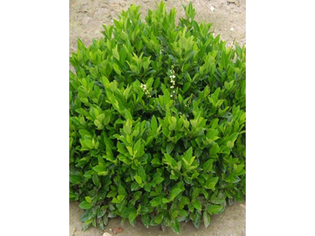 Kirschlorbeer 'Piri' - kleinere, immergrüne Sorte mit kompaktem, abgerundetem Wuchs. Wächst auf eine Höhe von 0,8-1 m und eine Breite von 1-1,3 m. Die jährlichen Zuwächse betragen 5-15cm. Die Blätter sind dunkelgrün, neue Triebe haben eine hellere Farbe. Ideal für niedrige Hecken oder zur Einfassung von Beeten. Die Pflanze ist giftig.