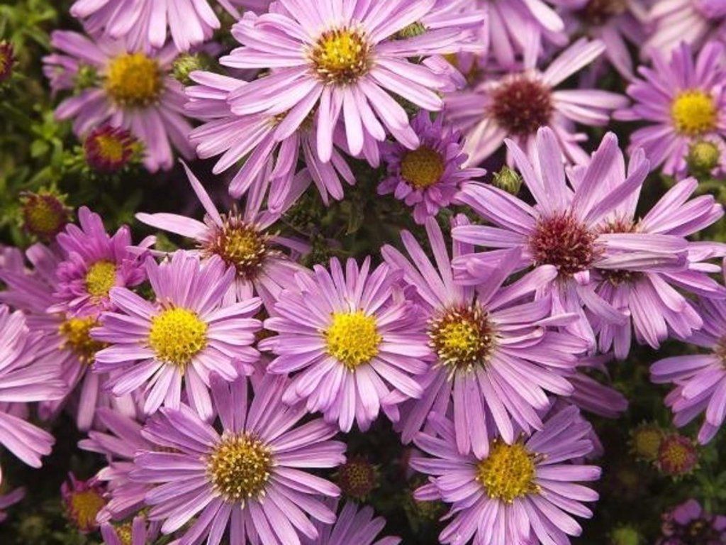Busch-Aster 'Beryll' - eine niedrige, kompakte Staude, die eine Höhe von 30–40 cm erreicht und dichte, reich blühende Horste bildet. Sie blüht im Herbst von September bis Oktober mit einer Fülle von zarten, hellvioletten bis lila Blüten mit einem kontrastierenden gelben Zentrum, die an kleine Gänseblümchen erinnern. Die Blätter sind dunkelgrün, schmal und verleihen der Pflanze auch außerhalb der Blütezeit ein attraktives Aussehen. Diese Aster ist pflegeleicht, verträgt Trockenheit und leichten Frost gut. Sie ist ideal für Herbstbeete, Steingärten, Kübel oder als Bodendecker. Sie ist auch bei Schmetterlingen und Bienen beliebt, was sie zu einer großartigen Wahl für insektenfreundliche Gärten macht.