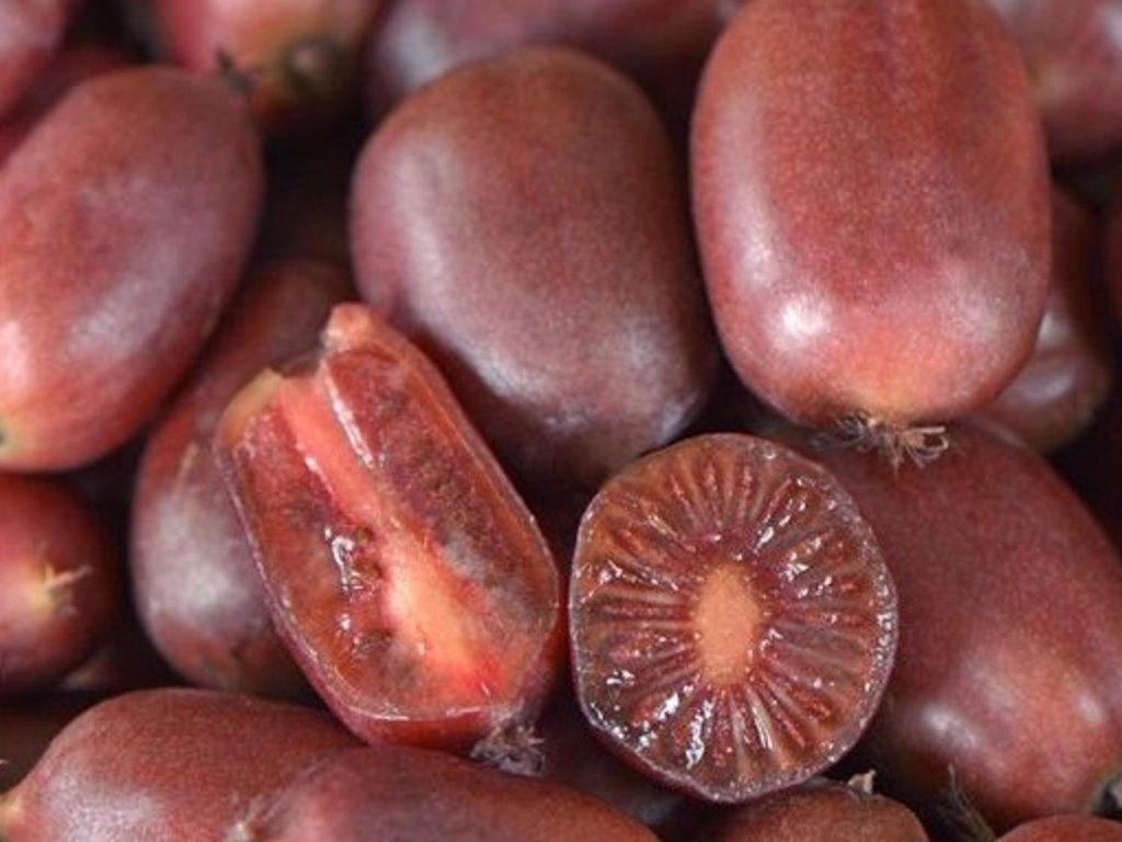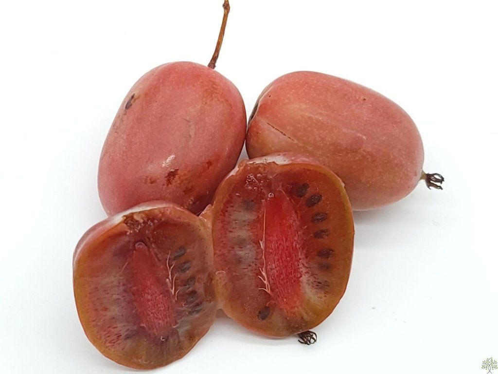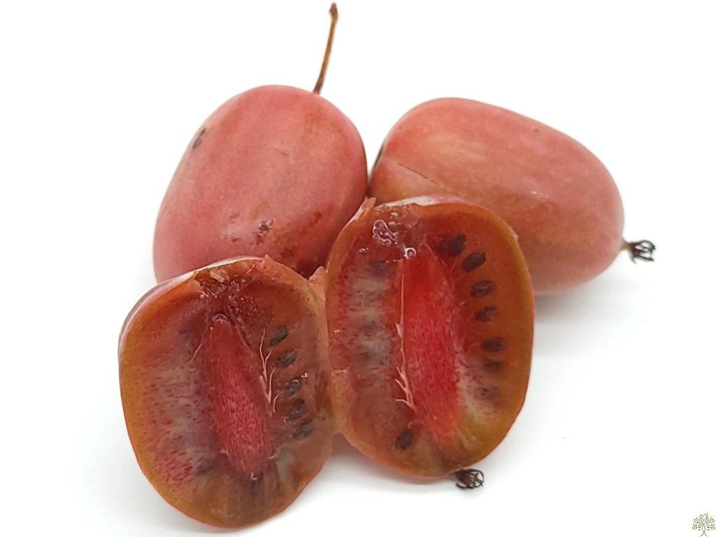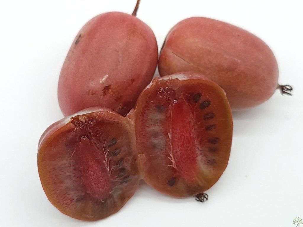 Kiwi 'Scarlet September' - eine neue Kiwi-Sorte mit roten, sehr schmackhaften Früchten von der Größe einer größeren Pflaume. Sie erreicht eine Höhe von 6-8 m. Sie erreicht eine Höhe von 6-8 m. Die Früchte werden mit Schale verzehrt, die glatt ist, genau wie bei einer Pflaume. Das Fruchtfleisch ist rot. Sie enthält eine hohe Menge an Vitamin C, genau wie alle Kiwis. Zur Bestäubung wird eine männliche Kiwi-Sorte, Weiki, benötigt. Die Pflanze benötigt eine Stütze. Die Kiwi reift von September bis Oktober.