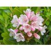 Rhododendron bloombux® Magenta - eine immergrüne Rhododendron-Sorte, die durch die Kreuzung der Arten Rhododendron hirsutum und Rhododendron micranthum entstanden ist. Sie wurde in Deutschland im Rahmen des Zuchtprogramms INKARHO gezüchtet, das auf kompakte und widerstandsfähige Rhododendren abzielt. Die Sorte ist auch unter der Bezeichnung Klon 'Microhirs9' bekannt. Die Pflanze bildet dichte, kompakte Sträucher mit kugelförmigem Wuchs, die im ausgewachsenen Zustand eine Höhe und Breite von etwa 60–90 cm erreichen. Die Blätter sind klein, elliptisch, glänzend und dunkelgrün und ähneln in ihrem Aussehen dem Buchsbaum. Ende Mai und im Juni erscheinen an den Triebspitzen zahlreiche kleine, trichterförmige Blüten in einem zarten weiß-rosa Farbton, die eine kompakte Blüte bilden. Dank der dichten Verzweigung und der guten Schnittverträglichkeit wird diese Sorte häufig als blühende Alternative zum Buchsbaum für niedrige Hecken, geformte Beeteinfassungen oder Pflanzungen im Vordergrund von Beeten verwendet. Sie eignet sich auch für die Kultivierung in größeren Gefäßen auf Terrassen und Balkonen, wo sie dank ihrer immergrünen Blätter das ganze Jahr über dekorativ bleibt.