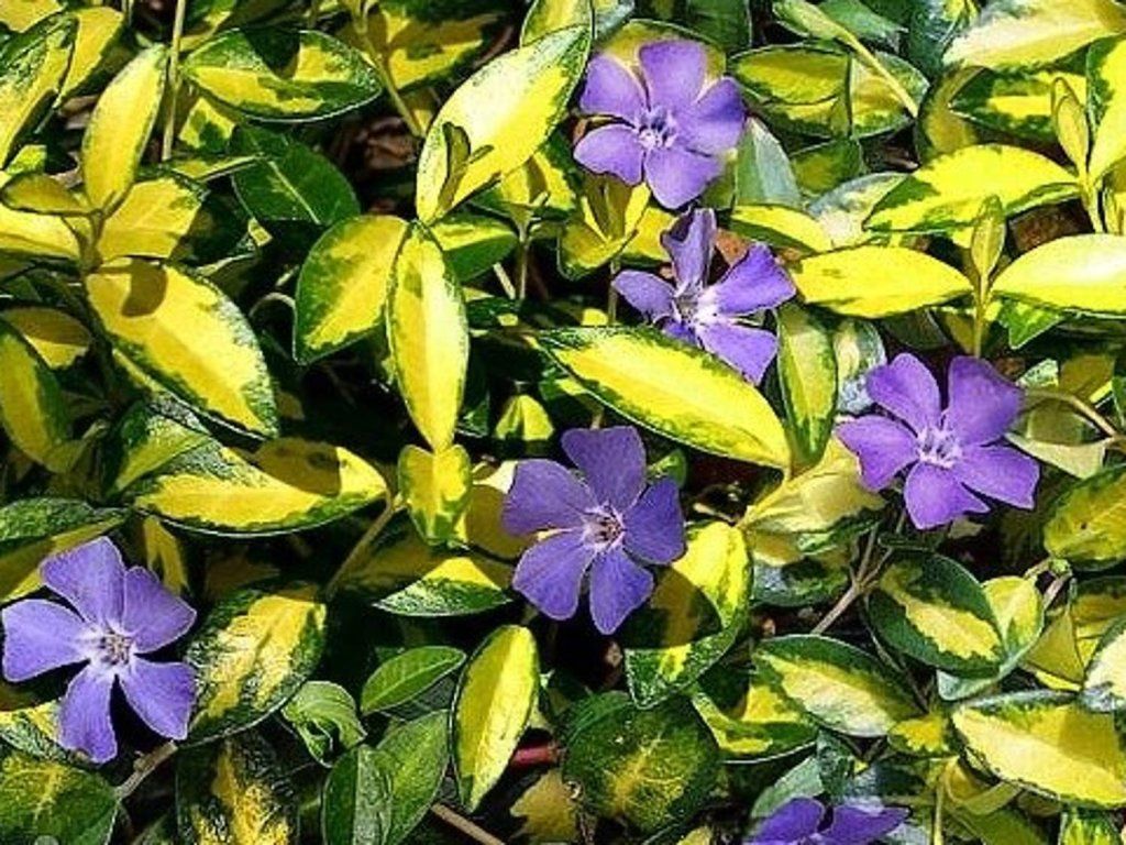 Kleines Immergrün 'Illumination' - eine bodendeckende, immergrüne Staude, die sich durch ihre auffällige Blattfärbung auszeichnet. Sie erreicht eine Höhe von 20-30 cm und breitet sich dank ihrer kriechenden Triebe schnell in die Breite aus. Die glänzenden Blätter sind tiefgrün mit einer auffälligen goldgelben Mitte, die eine schöne Panaschierung erzeugt. Im Frühjahr, meist von April bis Mai, blüht die Pflanze mit zarten, hellvioletten bis blauvioletten Blüten, die einen schönen Kontrast zu den goldgelben Blättern bilden. In geringerem Maße kann sie auch im Sommer blühen. Sie ist ideal zur Bodenbedeckung unter Bäumen, an Hängen oder in schattigen Beeten, wo sie einen dichten Teppich bildet und das Unkrautwachstum unterdrückt. Sie ist auch eine ausgezeichnete Wahl für Kübel und Hängeampeln, wo ihre Triebe effektvoll über die Ränder herabhängen.
