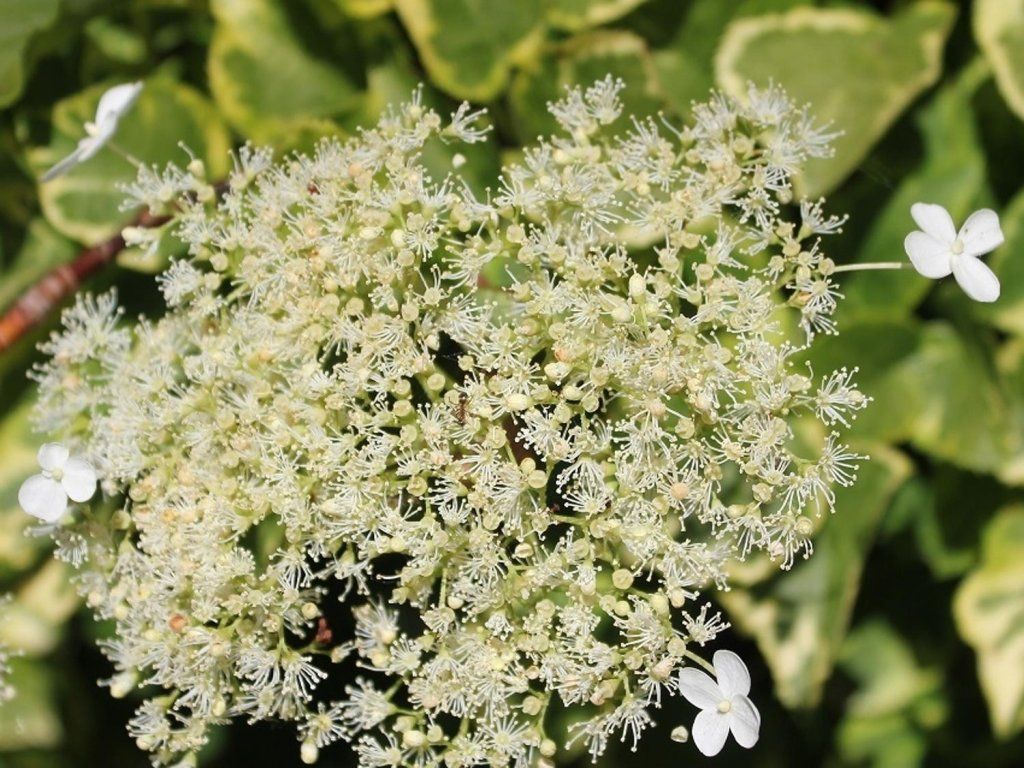 Kletterhortensie 'Mirranda' - eine kletternde Hortensie, die je nach Kulturbedingungen eine Höhe von 4-10 m und eine Breite von etwa 0,5-1,5 m erreicht. Sie zeichnet sich durch attraktive, panaschierte Blätter aus. Sie haben eine grüne Färbung in der Mitte und am Rand verläuft ein breiter Streifen in sattem Gelb. Sie sind herzförmig, fein gesägt. Im Herbst verfärben sie sich in leuchtend gelbe Farbtöne. Ab Mitte des Sommers erscheinen cremeweiße Blüten, die sich allmählich öffnen und in einer flachen Blüte angeordnet sind. Sie ist ideal für schattigere Standorte und für Böden mit leicht saurer Reaktion. Dieser Strauch kommt als Solitär hervorragend zur Geltung, findet aber auch im Garten, auf Beeten und auf der Terrasse seinen Platz. Insgesamt ist die Hortensie ein beliebtes Element für Gärten und verleiht jedem Garten ein zartes und romantisches Aussehen.