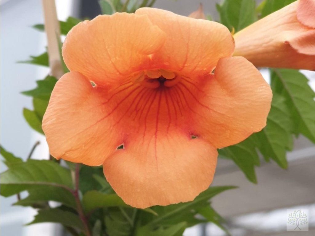 Trompetenblume 'Indian Summer' - eine attraktive Hybrid-Sorte mit schönen orange-rosa Blüten mit einem leichten rötlichen Stich. Diese Trompetenblume ist kompakter als übliche Sorten, was sie ideal für kleinere Gärten und Rankhilfen wie Pergolen oder Balkone macht. Sie erreicht eine Höhe von 3 bis 4 Metern. Die Blüten sind röhrenförmig und blühen üppig von Juli bis September und ziehen Bienen und Schmetterlinge an. Zudem ist sie relativ resistent gegen Schädlinge und Krankheiten, was sie zu einer anspruchslosen, aber sehr wirkungsvollen Kletterpflanze für Ziergärten macht. Sie hat hellgrüne, gefiederte Blätter, die im Herbst abfallen. Meistens haben sie weinrot-braune Ränder.