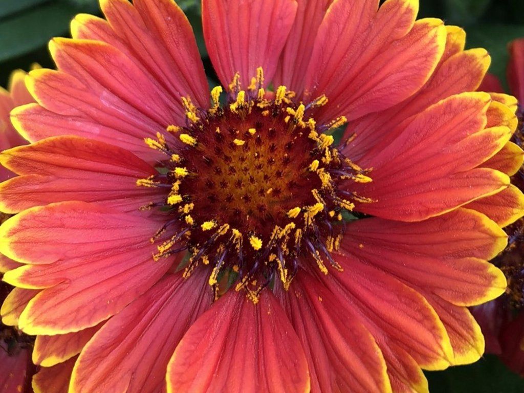 Gaillardia aristata 'Spintop Yellow Touch' - eine niedrige, reich blühende Staude, die sich durch auffällige Blüten mit einzigartiger Färbung und kompakten Wuchs auszeichnet. Sie ist besonders beliebt wegen ihrer Anspruchslosigkeit, langen Blütezeit und Anziehungskraft für Bestäuber. Sie erreicht eine Höhe von 20-30 cm. Sie hat rote, große, gänseblümchenartige Blüten mit rotem Zentrum und auffälligen gelben Blütenblattspitzen. Sie erscheinen von Juni bis September. Die Blätter sind grün, lanzettlich und leicht behaart. Ideal für die Bepflanzung von Staudenbeeten, trockenen Gartenbereichen, Steingärten, Kübeln oder gemischten Blumenkompositionen.