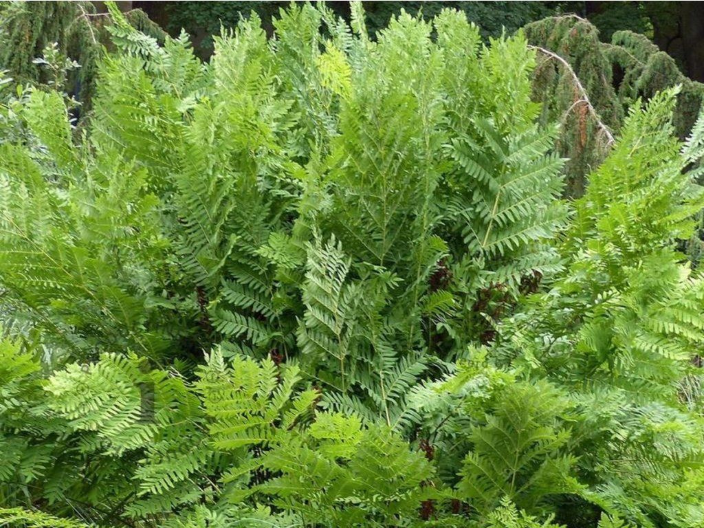 Königsfarn - ein wunderschöner, laubabwerfender Farn aus der Familie der Königsfarne, der in der Literatur oft als „blühender Farn“ bezeichnet wird, wegen auffälliger Sporangien an den Blattspitzen. Er wächst natürlich in Europa, Nordafrika und Teilen Südwestasiens, am häufigsten an den Rändern von Quellgebieten, in Erlenwäldern, Gräben und auf Moorwiesen mit saurem bis schwach saurem Boden. Aus einem kurzen Rhizom wachsen im Frühjahr breit ausgebreitete, doppelt gefiederte Blätter, die unter guten Bedingungen 120–180 cm erreichen und einen Horst von etwa 80–150 cm Durchmesser bilden. Die Blätter sind hell- bis mittelgrün, im Gegenlicht zart „durchscheinend“, und färben sich im Herbst goldgelb bis orange. Der fertile Teil der Blätter erscheint normalerweise im Juni und Juli als braune, körnig wirkende Ansammlungen von Sporangien an den Spitzen, ohne Blüten und Pollen. In Pflanzungen kommt er am Wasser, im halbschattigen Unterholz und in Regengärten gut zur Geltung, wo er sich gut mit Rodgersien, Funkien, Astilben, Seggen und Binsen kombinieren lässt. Auch die Blätter für Gestecke sind dekorativ, besonders im Spätsommer und Herbst.