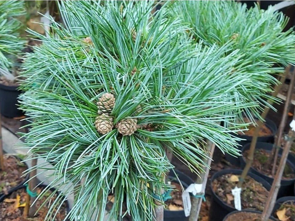 Koreanische Kiefer - Pinus koraiensis stammt ursprünglich aus Fernost, insbesondere aus Korea und Japan. Immergrüner Nadelbaum mit langsamem Wachstumstempo und charakteristischer kegelförmiger Krone. Die Rinde dieser Art ist gräulich und bleibt lange glatt. Der Baum erreicht eine Höhe von ca. 18-25 m. Die koreanische Kiefer hat weit ausgebreitete Seitenwurzeln, die ihr hervorragende Stabilität unter verschiedenen Bodenbedingungen verleihen. Die Nadeln sind in Fünferbüscheln angeordnet, dunkelgrün gefärbt und 6-12 cm lang. Auf der Außenseite sind die Nadeln dunkelgrün, während die Innenseite einen bläulich-weißen Schimmer aufweist. Junge Triebe sind mit rostig-filzigem Flaum bedeckt und die Winterknospen sind rotbraun gefärbt, was zum dekorativen Aussehen des Baumes beiträgt. Die koreanische Kiefer ist unter den Bedingungen Mitteleuropas absolut widerstandsfähig. Sie bevorzugt volle Sonne und einen geräumigen Standort. Sie gedeiht am besten auf trockenen bis leicht feuchten, gut durchlässigen, sauren Böden mit angemessenem Nährstoffangebot. Wenn sie jedoch zu feuchten Bedingungen ausgesetzt ist, kann sie an innerer Stammfäule leiden. Diese Kiefernart eignet sich für die Solitärpflanzung, kann aber auch in kleinere, lockere Gruppen integriert werden. Im Landschaftsdesign harmoniert sie hervorragend mit verschiedenen Nadelbaumarten, einschließlich Zwergformen, sowie mit luftigen und leichten Laubgehölzen. Die koreanische Kiefer ist somit ein geeigneter Kandidat für vielfältige Gartenkompositionen, wo sie ihr ästhetisches Potenzial voll entfalten kann.
