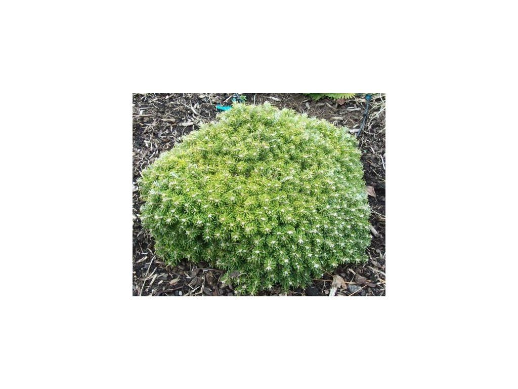 Edel-Tanne 'Silberkugel' - Tanne mit Zwergwuchs, die Form ist flach bis fast kugelförmig. Im Alter von 20 Jahren erreicht sie eine Höhe von 25 - 40 cm, die jährlichen Zuwächse liegen bei etwa 25 mm. Die Zweige sind kurz, die Nadeln sind kürzer, haben eine gelbgrüne bis dunkelgrüne Färbung, sind verdreht und die Unterseite hat eine silberne Färbung. Eignet sich für Steingärten oder Heidegärten.