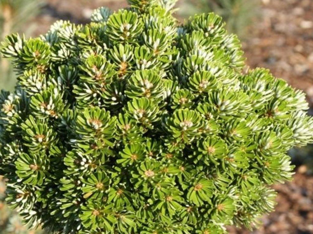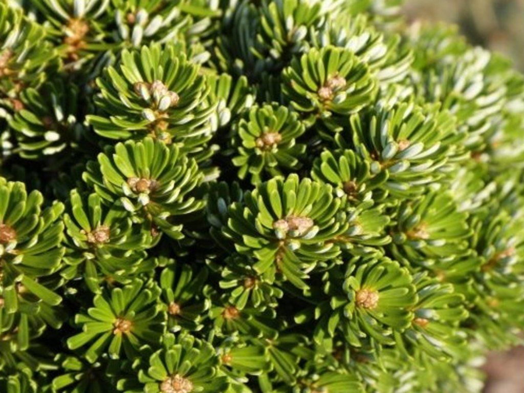 Edeltanne 'Wellenseind' - langsam wachsender Kultivar mit kompakter, runder Form. Die Nadeln sind auf der Oberseite grün, auf der Unterseite silberweiß. Die Knospen sind deutlich sichtbar, besonders im Winter. Im Alter von zehn Jahren erreicht sie eine Höhe von 25 cm und eine Breite von 35 cm.