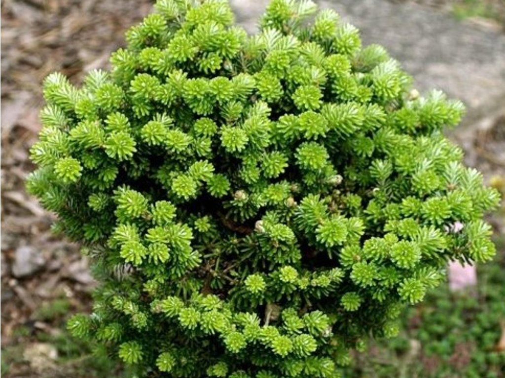 Koreanische Tanne 'Pinocchio' - eine sehr langsam wachsende Tanne, die eine regelmäßige Kugelform bildet. Im Alter von 20 Jahren erreicht sie eine Höhe von 0,4 - 0,5 m. Die jährlichen Zuwächse betragen maximal 5 cm. Die Nadeln haben eine frische, tiefgrüne bis bläulich-grüne Farbe. Sie sind kurz. Dieser Kultivar kommt auf einem Stamm wunderbar zur Geltung.