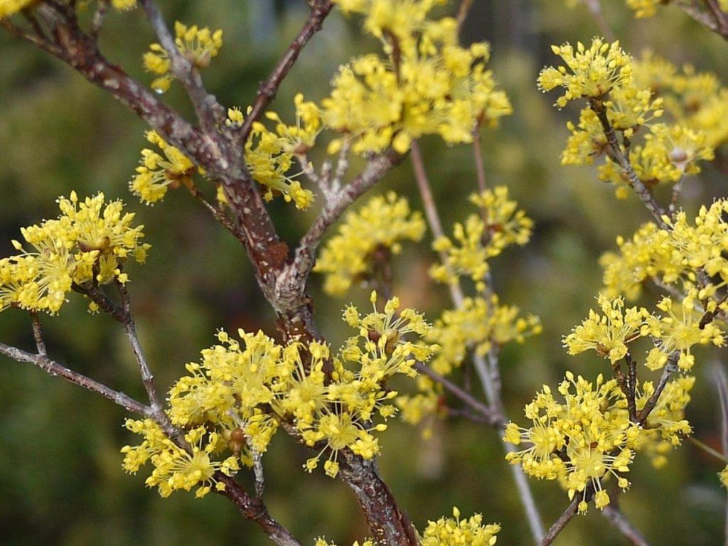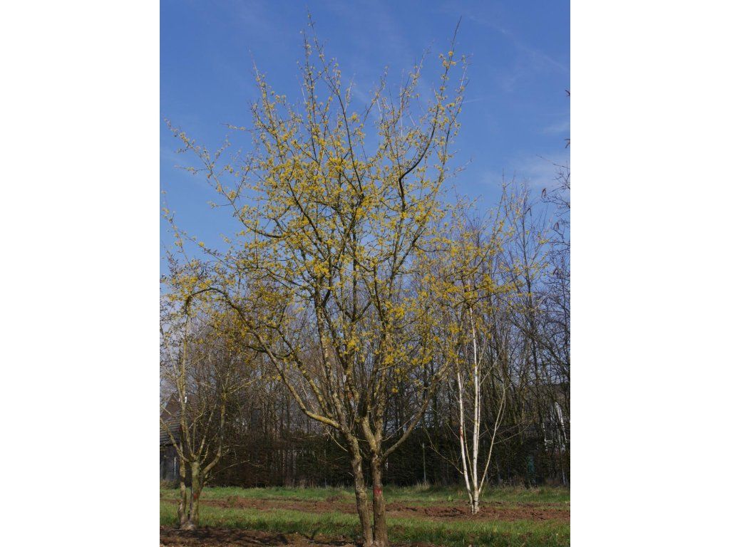 Kornelkirsche 'Robin's Pride' - ein mittelgroßer Baum oder Strauch, der 4 - 7 m hoch wird. Die Krone ist oval, dunkel, dicht und vielgestaltig wachsend. Junge Zweige sind braun, die Rinde älterer Bäume ist dann graubraun und beim Abblättern olivgrün. Bereits im Februar und März, also vor dem Austreiben der Blätter, erscheinen Büschel kleiner gelber Blüten am Baum, die an kahlen Zweigen wirklich prächtig aussehen. Die Blätter sind im Sommer dunkelgrün und mit Einsetzen des Herbstes färben sie sich gelb bis rotviolett. Nach der Blüte bilden sich rote Früchte am Baum, die essbar sind. Diese Sorte zeigt eine wahre Farbenpracht. Sie wird so zu einer Solitärpflanze in Ihrem Ruhebereich.