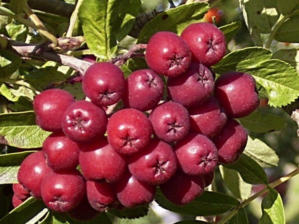 Eberesche 'Titan' - eine Sorte, die 2,5 - 3 m hoch wird. Trägt im zweiten bis dritten Jahr. Die Fruchtbarkeit ist reichlich und regelmäßig. Die Sorte ist sehr gut frostbeständig. Anspruchsloser Baum. Eignet sich auch für Randlagen. Die Früchte sind groß, violett-orange gefärbt. Sie sind in Büscheln angeordnet. Der Geschmack ist süß-sauer. Wir ernten sie zum Ferienende. Eine Sorte für vielseitige Verwendung.
