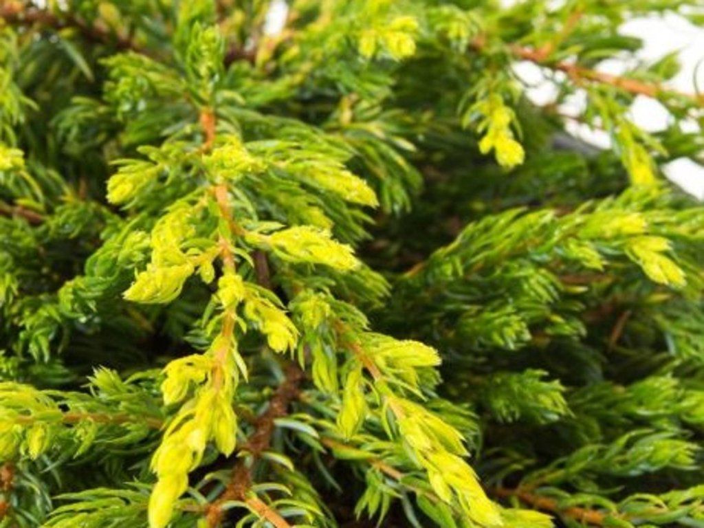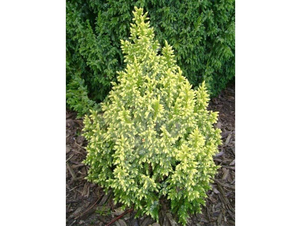 Wacholder 'Hulsdonk Yellow' - ein Wacholder, der sich durch langsames Wachstum auszeichnet. Er erreicht normalerweise eine Höhe von etwa 1,5 m und eine Breite von 0,6 m. Der Habitus der Pflanze ist säulenförmig. Junge Triebe leuchten in Gelbtönen und nehmen dann grüne Töne an. Die Triebspitzen können das ganze Jahr über eine gelbliche Färbung behalten. Die jährlichen Zuwächse betragen 4 - 8 cm. Er ist somit ideal als Solitärpflanze für den Steingarten, auch die Kultivierung im Kübel ist geeignet.