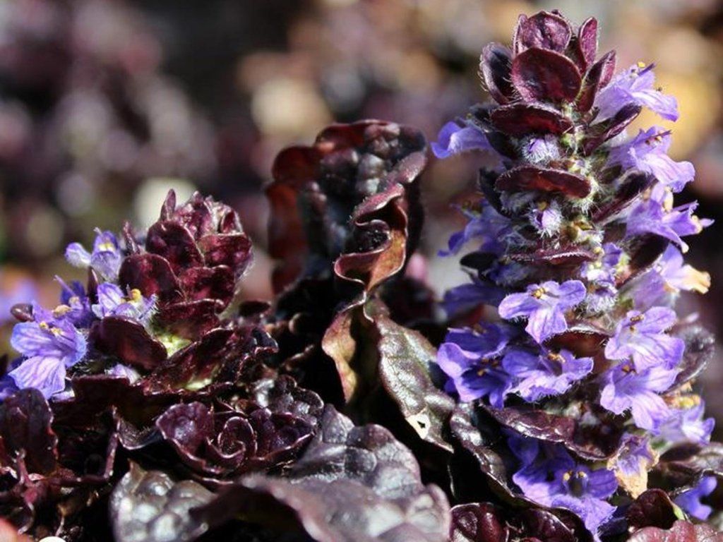 Kriechender Günsel 'Black Scallop' - ist eine ausdauernde krautige Pflanze mit einem kurzen Rhizom, aus dem büschelig verzweigte Wurzeln und kriechende Triebe wachsen. Die Blüten sind kurz gestielt, bis zu 1,5 cm lang, lippenförmig, rau behaart und violettblau. Sie wächst auf Wiesen, in Gärten, in lichten Wäldern und Hainen, an feuchteren Standorten. Der Kriechende Günsel ist fast in ganz Europa verbreitet. Er ist als Zierstaude und Steingartenpflanze sehr beliebt. Dank ihres teppichartigen, bodendeckenden Wuchses eignen sie sich für die Einfassung von Staudenrabatten, für größere Steingärten, aber auch zur Bedeckung größerer Flächen. Der Günsel gedeiht in voller Sonne oder im Halbschatten, Gartenerde, eher feucht. Frostbeständigkeit bis -40°C.