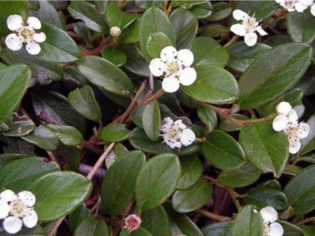 Zwergmispel 'Mooncreeper' - immergrüner, bodendeckender Strauch, der bis zu 0,3 m hoch wird. Seine steifen Blätter sind klein, oval, dunkelgrün und glänzend. Während Mai und Juni werden sie von kleinen weißen Blüten ergänzt. Im Herbst erscheinen rote Beeren, die eine geeignete Nahrungsquelle für Vögel sind. Die Sträucher werden hauptsächlich zur Befestigung von Hängen, für Steingärten usw. verwendet.