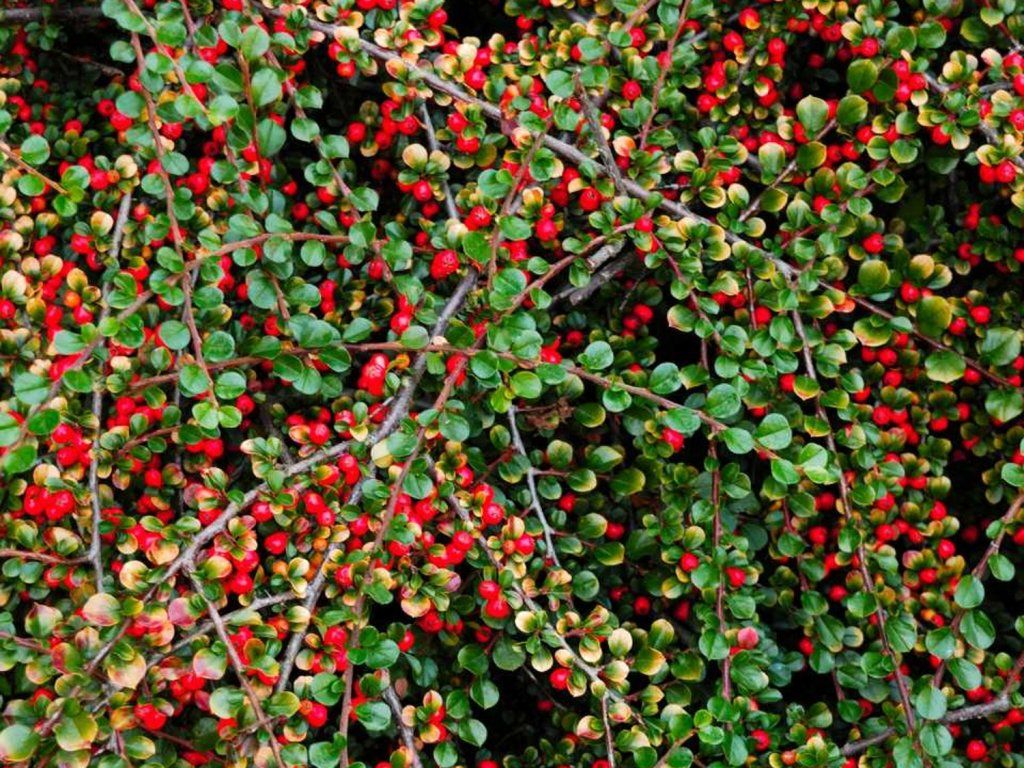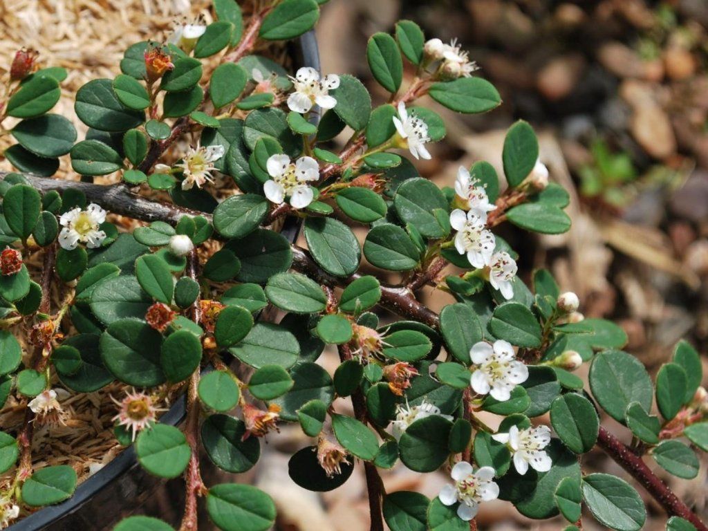 Cotoneaster microphyllus 'Queen of Carpets' - ein Favorit unter den Zwergmispeln, der eine Höhe von etwa 20 cm erreicht. Stammt aus China. Bildet einen sehr attraktiven, niederliegenden bis kriechenden Strauch. Zeichnet sich durch lange und verholzte Triebe aus, die dicht mit kleinen und glänzenden Blättern von grüner bis grau-grüner Farbe bedeckt sind. Von Mai bis Juni erscheinen kleine weiße Blüten und im September und Oktober reifen rote Beeren. Eine ideale Bodendeckerpflanze zur Befestigung von Hängen oder für den Steingarten.