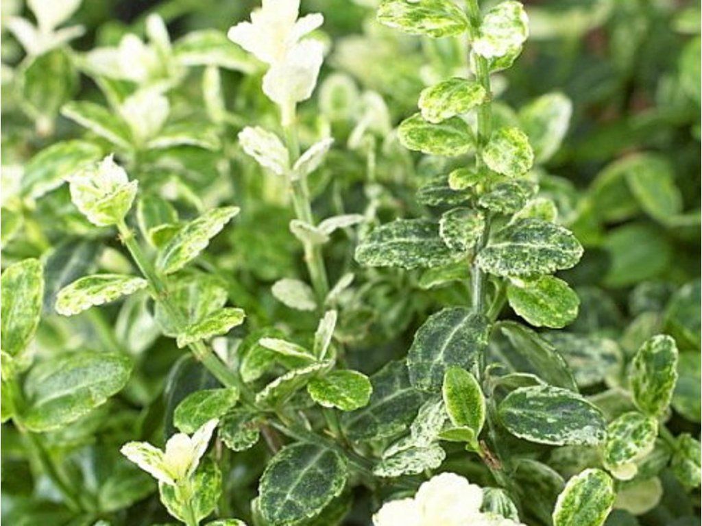 Euonymus fortunei 'Silverstone' - eine der weniger wachsenden Sorten. Er hat ein wunderschönes und sehr dekoratives Laub. Die Blätter sind panaschiert. Die Mitte des Blattes ist dunkelgrün, die gesamte Blattfläche ist weiß bis cremefarben gefärbt. Die einzelnen Farben gehen ineinander über. Im Frühling und Sommer trägt sie kleine weiße Blüten. Sie erreicht eine Höhe von etwa 30 - 40 cm.