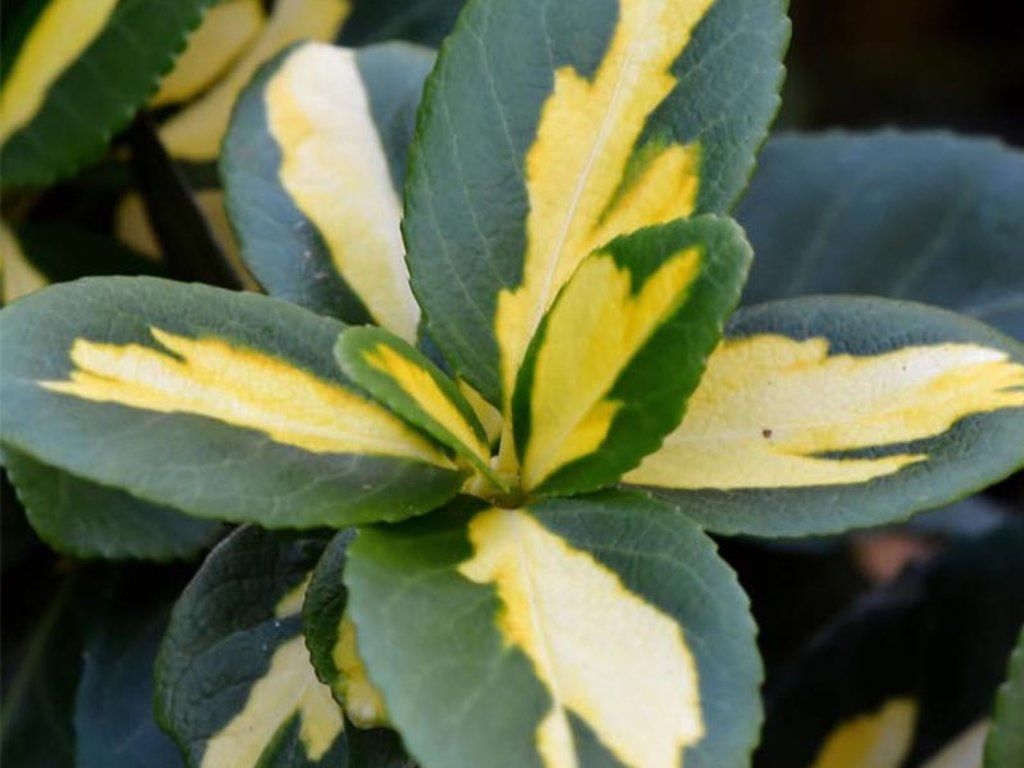 Euonymus fortunei 'Sunspot' - ein kompakter, ausladender Strauch, der bis zu 1 m hoch und breit wird. Fein gezähnte, längliche Blätter sind dunkelgrün mit cremefarbener gelber Panaschierung, die im Herbst dazu neigt, sich rosa zu verfärben. Die Pflanze ist pflegeleicht und verträgt Rückschnitte sehr gut. Er kommt als Solitär oder in Gesellschaft anderer Ziersträucher oder Stauden wunderschön zur Geltung.