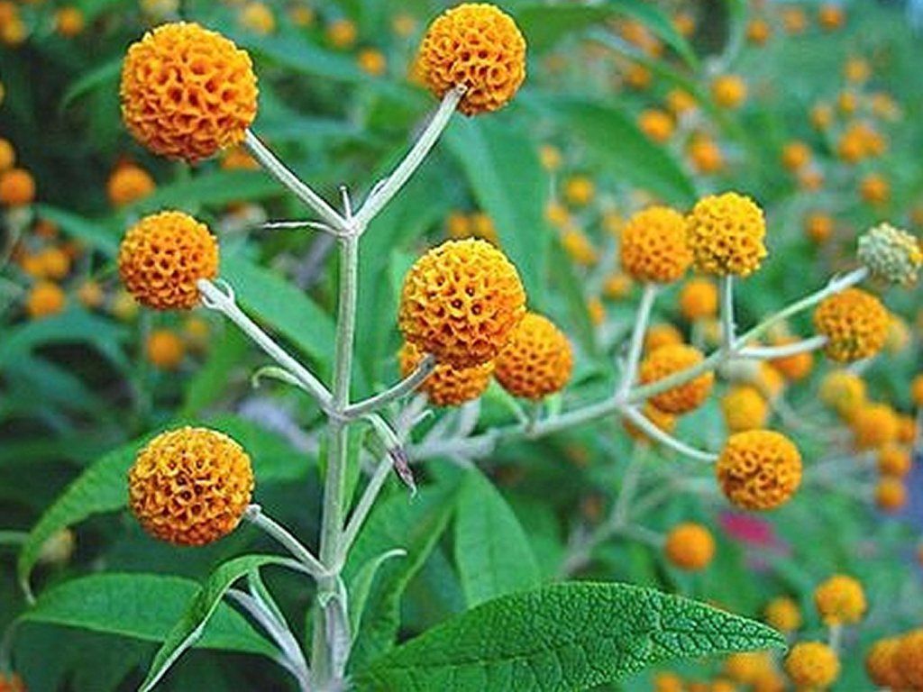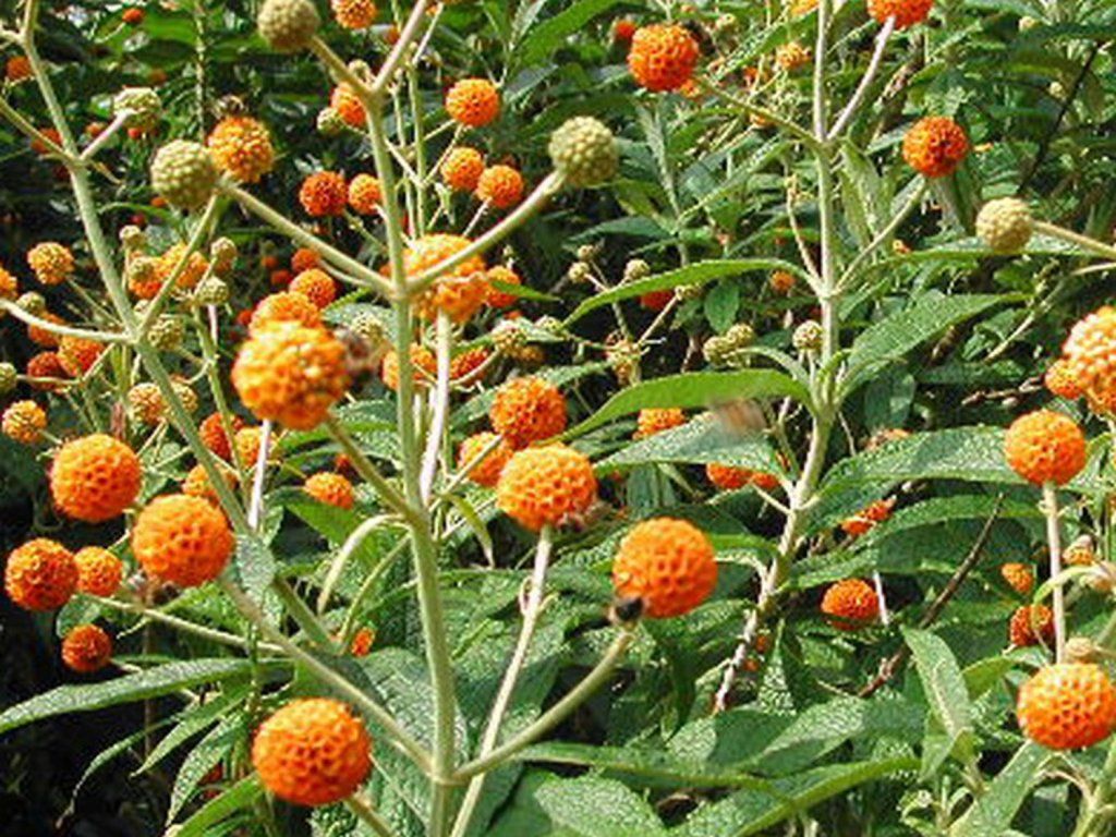 Kugelige Sommerflieder - ein Zierstrauch aus Südamerika, speziell aus Chile und Argentinien. Wächst je nach Kulturbedingungen 2-5 m in die Höhe. Diese Art ist einzigartig durch ihre kugelförmigen Blütenstände, die aus kleinen orangefarbenen bis gelben Blüten bestehen. Sie sind durchschnittlich ca. 2-3 cm groß und erscheinen von Mai bis Juni. Die Blätter sind oval bis lanzettlich, dunkelgrün, auf der Unterseite filzig mit feinen grau-weißen Härchen. Sie können bis zu 20 cm lang werden. Dank ihres exotischen Aussehens und ihrer pflegeleichten Natur ist sie eine beliebte Ergänzung für Ziergärten.