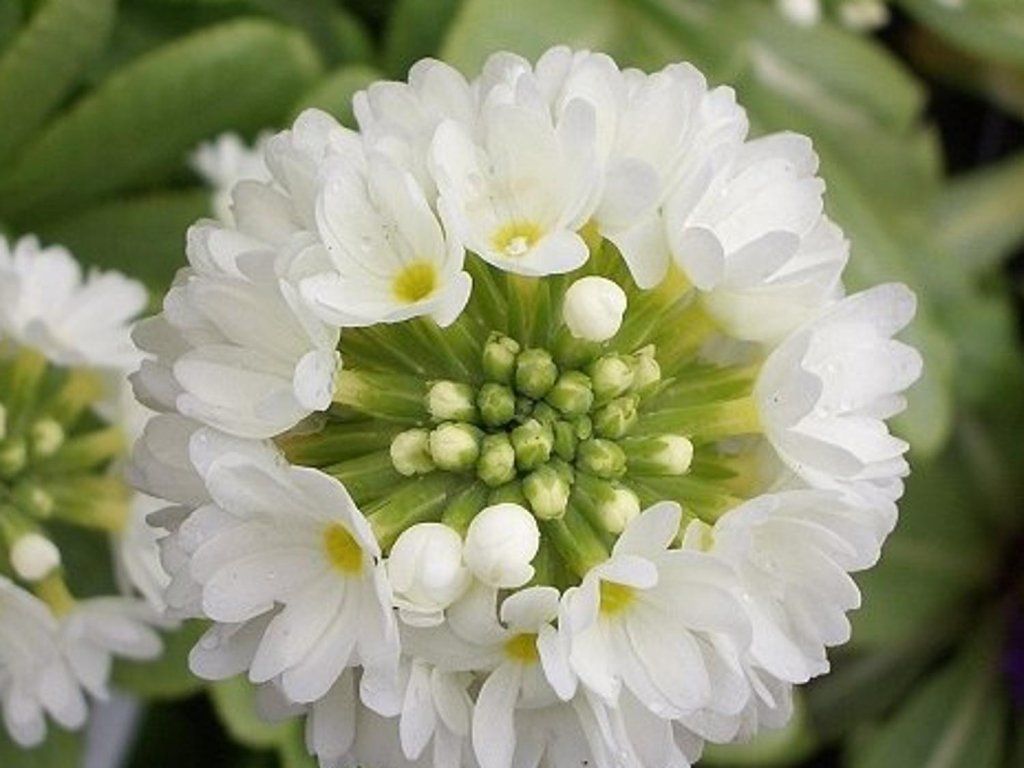 Kugel-Primel 'Alba' - stammt aus Bergregionen von Afghanistan über den Himalaya bis nach Westchina, wo sie feuchte Wiesen, grasbewachsene Hänge und Lichtungen in lichten Gebüschen besiedelt. Die Sorte 'Alba' trägt von März bis April feste, kugelförmige Dolden mit 6–8 cm Durchmesser, bestehend aus kleinen weißen Blüten mit einem hellgelben Auge. Die Blütenstände halten sich zunächst niedrig in der Blattrosette, später erheben sie sich auf Stiele, die normalerweise 0,25–0,40 m hoch sind. Die Blätter sind hell- bis mittelgrün, länglich-eiförmig, fein gezähnt und verlängern sich nach der Blüte, so dass der Horst auch im späten Frühling kompakt wirkt. In der Komposition macht sie sich an Wegrändern, in naturnah gestalteten Beeten und als feiner Kontrast zu Narzissen, Blausternen, Lerchensporn oder Christrosen gut. Die Blüten werden von frühen Bestäubern besucht, besonders an wärmeren Tagen. Aufgrund der frühen Blüte macht sie sich auch gut unter Laubgehölzen, wo im Frühjahr Licht durchdringt und im Sommer der Boden kühler bleibt. Die Pflanze duftet nicht auffällig und der Saft aus den Blättern kann bei empfindlichen Personen Hautreizungen hervorrufen, weshalb man üblicherweise mit Handschuhen damit arbeitet. Sie ist beliebt für die Pflanzung in schattigen Gartenbereichen, unter Bäumen oder im Steingarten. Sie eignet sich auch für die Randbepflanzung von Beeten oder für Balkonkästen auf der Terrasse oder dem Balkon.