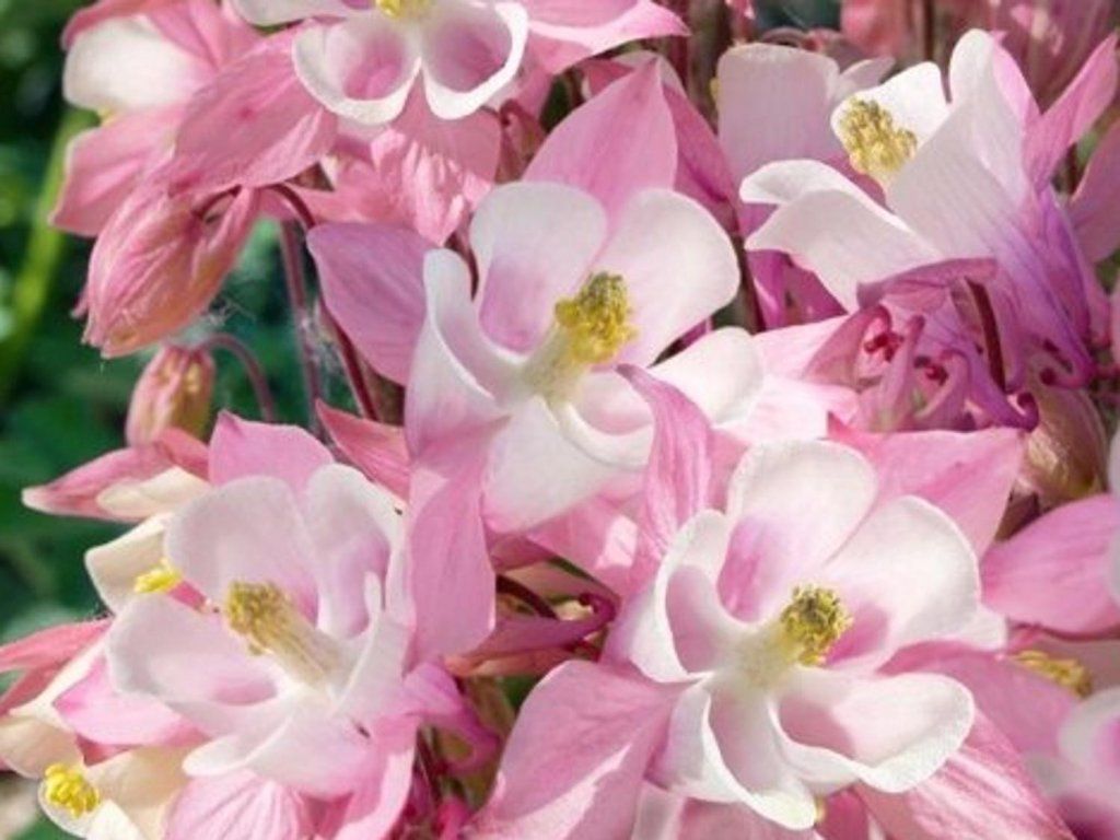 Gemeine Akelei ´Biedermeier´ - Akelei, die etwa 50 cm hoch wird. Die Blüte selbst wirkt exotisch. Die Stempel in der Mitte der Blüte sind hellgelb und blühen in rosafarbenen, roten, violetten oder weinroten Farbtönen. Sie blühen im Mai und Juni. Das Laub hat eine frische grüne Farbe. Die Staude eignet sich für Beete, Blumenkästen oder Steingärten.