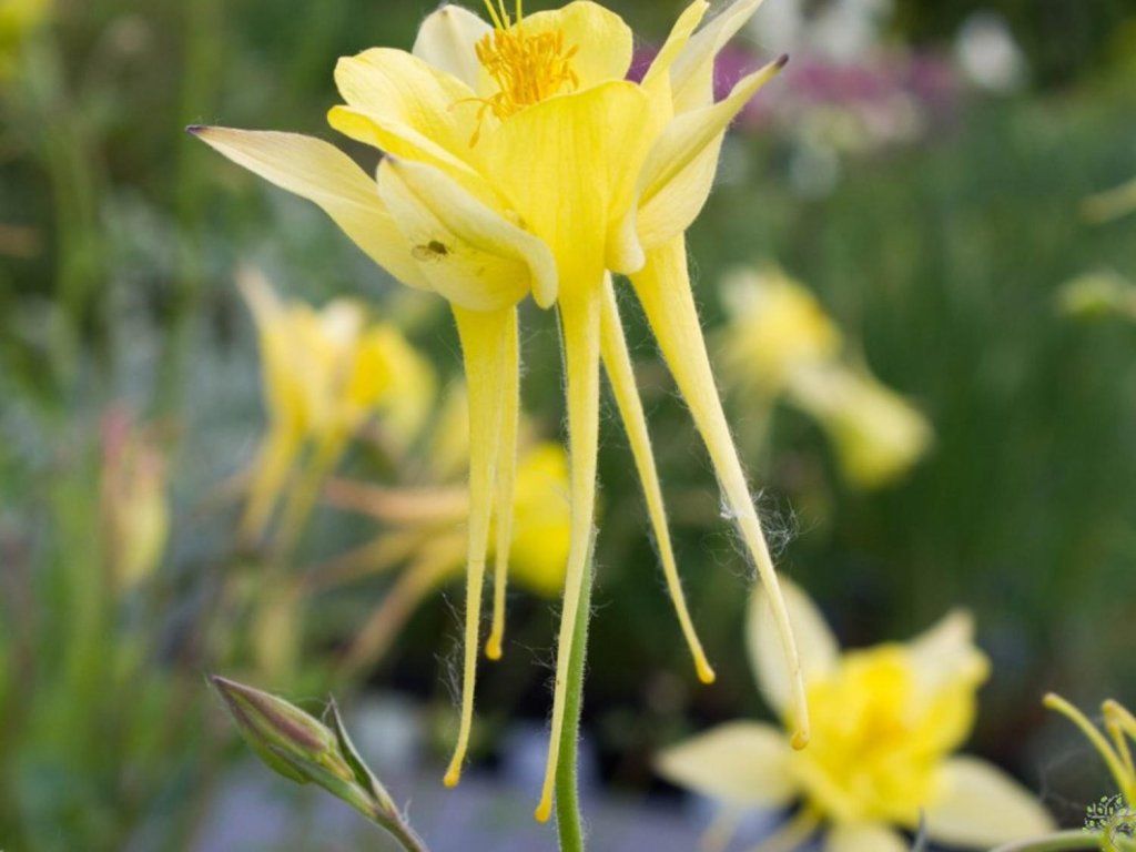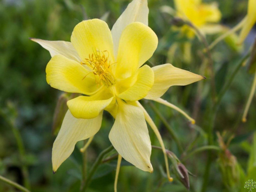 Akelei 'Maxi' - diese wunderschöne Staude hat unregelmäßige Blütenblätter, die sich zur Mitte hin von einem hellen Gelb zu einem kräftigeren Gelb verändern. In der Mitte der Blüte befinden sich leuchtend gelbe Staubgefäße. Die Blätter sind kleiner und regelmäßig. Sie wächst bis zu 60 cm hoch. Sie blüht von Mai bis Juni. Sie kann in einem Staudenbeet oder am Rand von Steingärten gepflanzt werden. Sie sieht auch in Kübeln gut aus.