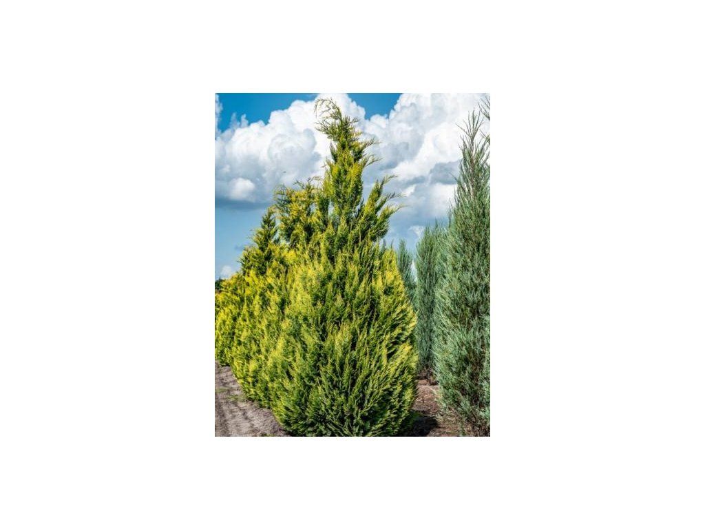 Scheinzypresse 'Alumigold' - dicht verzweigte Zypresse. Das Wachstum ist mäßig schnell, im Alter von 20 Jahren erreicht sie eine Höhe von 4 - 5 m. Die Krone ist schmal kegelförmig, die Äste sind flach. Die Nadeln sind schuppig, hellgrün. Junge Triebe hingegen haben eine leuchtend gelbe Färbung. Die Zapfen sind kugelförmig, haben einen Durchmesser von 8 - 10 mm und reifen im August und September. Sie wird auch für Zäune verwendet, wo sie im Abstand von 50 - 60 cm gepflanzt wird.