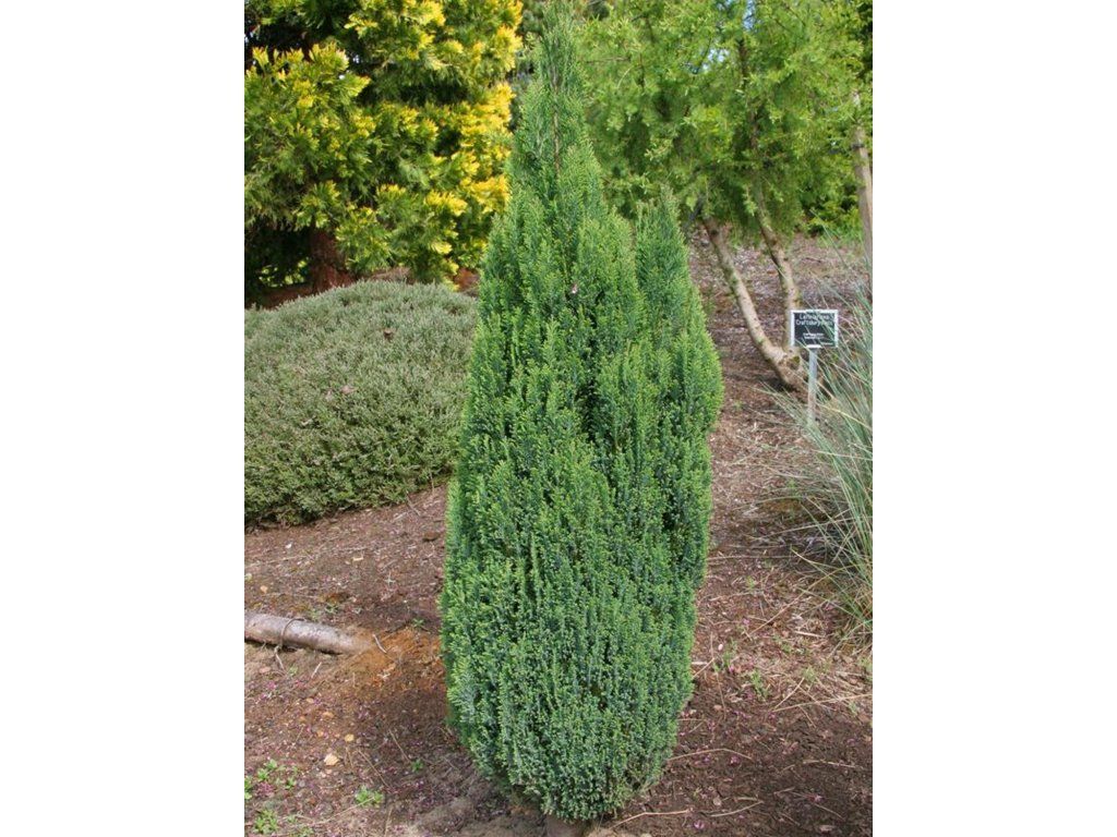 Scheinzypresse 'Ellwood's Pillar' - eine Zypresse mit schmalem bis säulenartigem Wuchs, die im Alter eine weniger regelmäßige Form aufweist. Etwa im Alter von 10 Jahren erreicht sie eine Höhe von 1 m, im Alter von 20 Jahren etwa 1,5 m und eine Breite von etwa 40 - 70 cm. Die Nadeln haben einen bläulichen Schimmer, aber die Grundfarbe bleibt ein graugrüner Farbton. Die Nadeln erinnern auf den ersten Blick eher an Schuppen. Die Äste wachsen insgesamt nach oben, was sehr ordentlich wirkt. Die Pflanze ist ideal für Kübel und Steingärten. Sie bevorzugt kalkhaltige Böden.