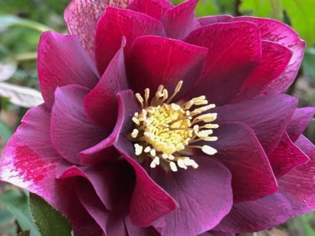 Christrose 'Double Ellen Red' - Staude, die eine Höhe von 30 - 40 cm bei einer Breite von 40 - 50 cm erreicht. Diese Art zeichnet sich durch ihre Blütezeit aus, die meist im Februar bis April blüht, je nach Wetterentwicklung. Es kann vorkommen, dass die Blüten Sie bereits im Dezember überraschen. Die Sorte ist gefüllt blühend, die Blütenblätter haben abgerundete Enden, die Blüte hat eine schalenförmige Form und strahlt in einem dunkelweinroten Farbton. Die unteren Blütenblätter weisen eine deutliche helle Marmorierung auf, cremefarbene Staubgefäße sind sichtbar und bilden einen interessanten Kontrast. Die Stiele sind aufrecht und bilden mit den Blüten einen leichten Überhang. Die Blätter wachsen in Büscheln, sind immergrün, ledrig, handförmig und dunkelgrün. Geeignet für Gruppenpflanzungen. Sie kommt in Kombination mit Kuhschellen und Lungenkraut gut zur Geltung. Wirkt sehr dekorativ in Gefäßen, die in der Nähe von Eingangstüren aufgestellt werden.