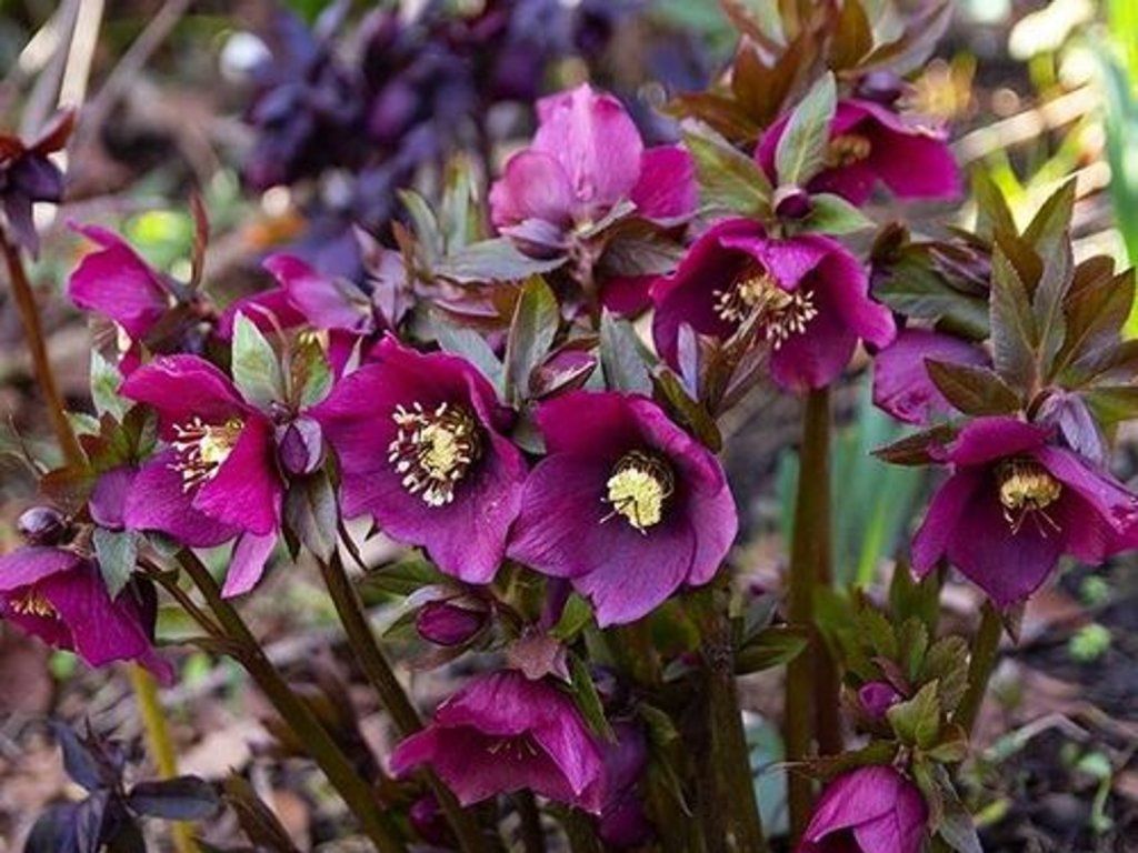 Christrose 'Pretty Ellen Red' - eine Christrosensorte, die eine Höhe von 30 - 40 cm erreicht, bei einer Breite von etwa 40 - 50 cm. Aufrechte Blütenstiele tragen einfache, dunkelrotviolette Blüten. In der Mitte der Blüte sehen wir beige Staubblätter. Auf den ersten Blick wirkt sie samtig. Abhängig vom Wetter blüht sie von Februar bis April und blüht sehr lange. Die Blätter bilden Büschel, sind immergrün, handförmig und dunkelgrün. Wenn die Wintertemperaturen günstig sind, können die ersten Blüten Sie bereits im Dezember überraschen. Geeignet für Gruppenpflanzungen. Sie kommt gut in Kombination mit Kuhschellen, Lungenkraut und Zwiebelblumen zur Geltung. Wirkt sehr dekorativ in Gefäßen, die in der Nähe von Eingangstüren aufgestellt werden.