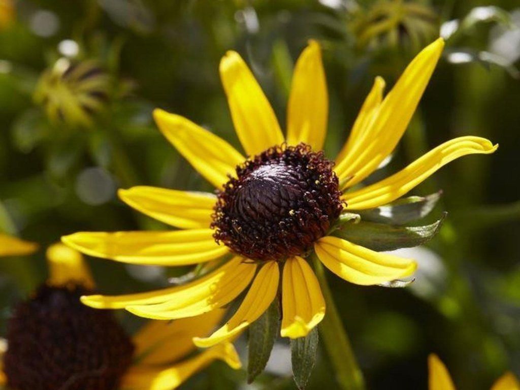 Rudbeckia fulgida 'Little Goldstar' - eine kompakte Staude, die sich durch üppige Blüte und leuchtend goldene Blüten auszeichnet. Diese Sorte ist eine kleinere Version der beliebten Rudbeckia fulgida, erreicht eine Höhe von etwa 40–50 cm und bildet dichte, abgerundete Büsche. Die Blüten sind typisch für ihre ausgeprägten, goldgelben Blütenblätter, die ein dunkles, fast schwarzes Zentrum umgeben. Die Blütezeit beginnt im Sommer und dauert bis zum frühen Herbst an. Die Pflanze produziert eine große Menge an Blüten, die Bienen, Schmetterlinge und andere Bestäuber anziehen. Sie ist hervorragend trockenheits- und hitzebeständig, was sie zu einer idealen Wahl für Gärten, Beetränder und die Kübelbepflanzung macht.