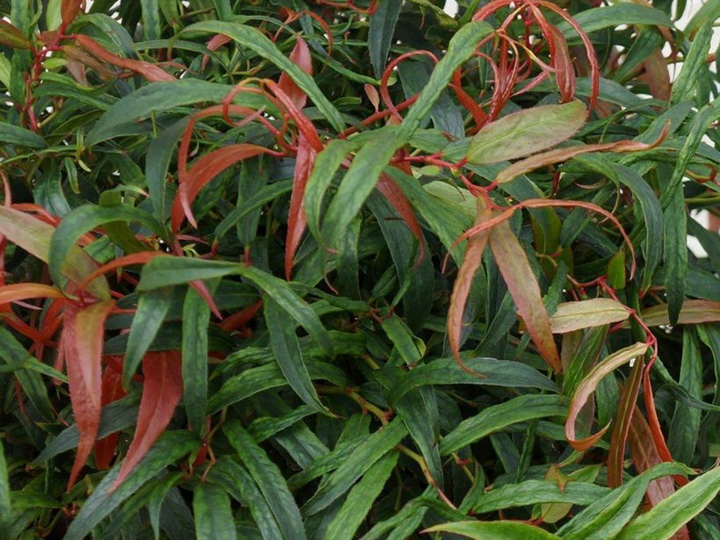 Leucothoe 'Halloween' - ein sehr kompakter Strauch, der je nach Kulturbedingungen eine Höhe und Breite von etwa 40 – 60 cm erreicht. Es handelt sich um einen immergrünen Strauch, der durch seine schmalen, lanzettförmigen und glänzenden Blätter besticht. Diese haben anfangs einen tiefgrünen Farbton, mit dem Einzug der Herbst- und Wintermonate ändert sich die Farbe zu weinroten Tönen. Im Laufe des Mai blüht die Pflanze mit unscheinbaren, glockenförmigen Blüten in Weiß. Der Strauch zeichnet sich durch hohe Frostbeständigkeit aus und eignet sich als Bodendecker.