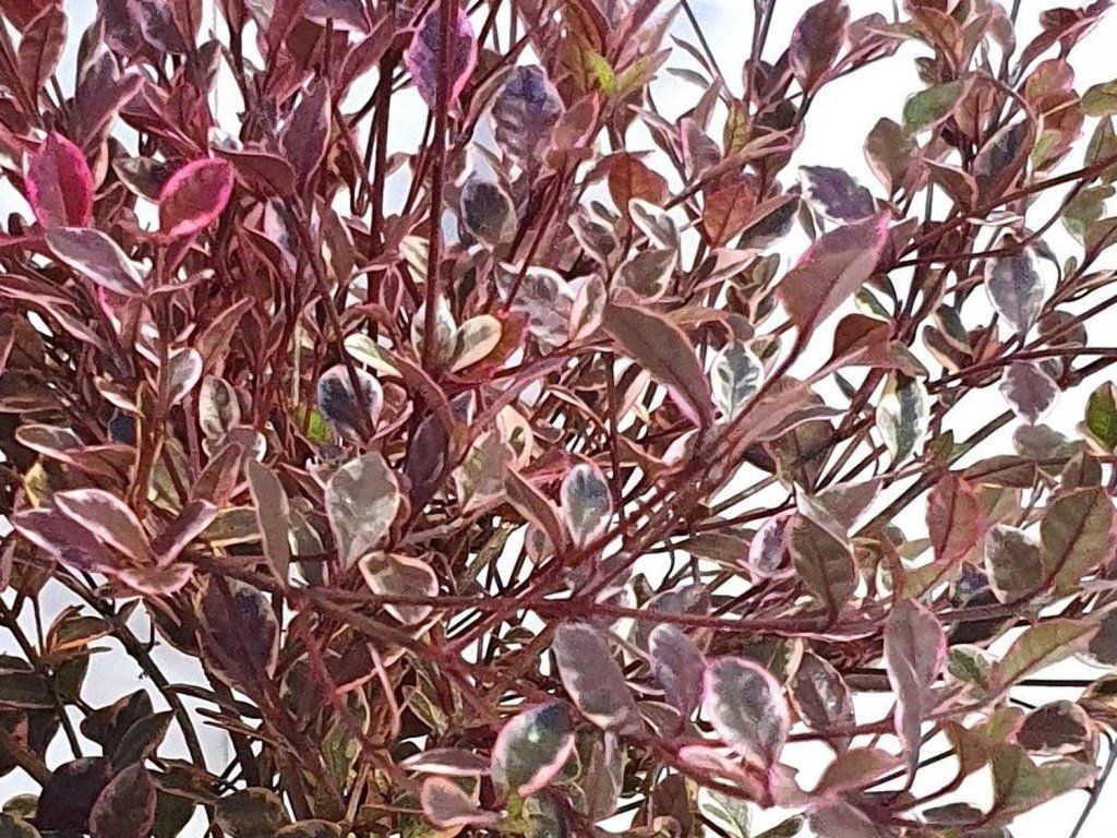 Lophomyrthus ralphii 'White Tiger' - strauchartiger, immergrüner Strauch, der bis zu 1 m hoch und 1,5 m breit wird. Er hat kleinere, eiförmige Blätter mit einer ausgeprägten Spitze. Beim Austrieb sind sie rosa-rötlich, später grün mit cremefarbener bis rosa Panaschierung. Im Laufe des Jahres werden sie noch dunkler. Die Blätter sind schalenförmig, haben eine weiße Farbe und auffallend lange Staubgefäße. Unter unseren Bedingungen kultivieren wir ihn als Kübelpflanze.