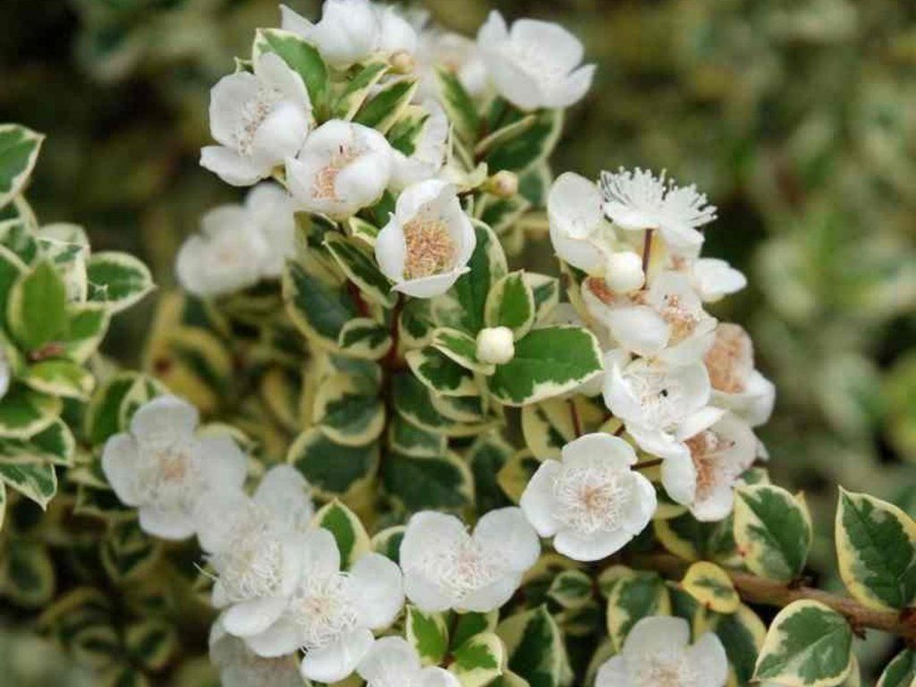 Luma apiculata 'Glanleam Gold' - ungewöhnlicher, immergrüner aromatischer Strauch. Das Wachstum ist sehr langsam, nach zehn Jahren erreicht er eine Höhe von 1,5-2m und eine Breite von 1,5m. Er hat dunkelgrüne Blätter mit attraktiv gelb gesäumten Rändern. Ihre Form ist eiförmig mit einer ausgeprägten Spitze. Von Juli bis September ist der Strauch mit kleinen, einfachen weißen Blüten übersät. Unter unseren Bedingungen kultivieren wir ihn ausschließlich als Kübelpflanze.