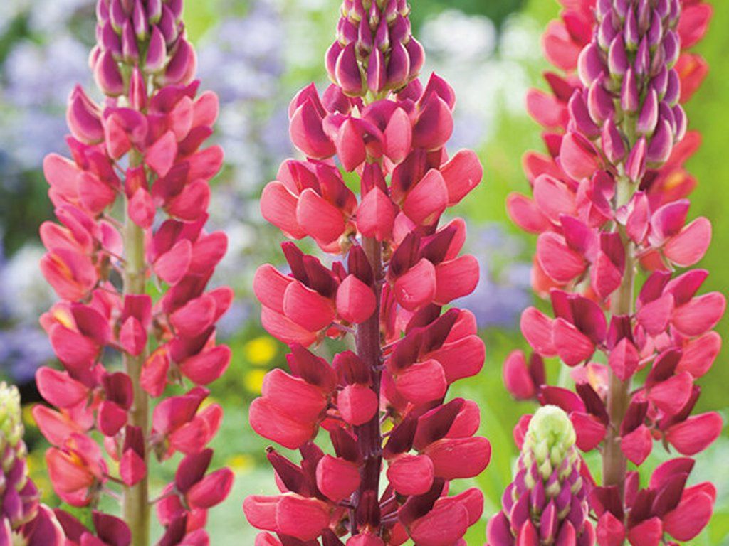 Anbau: Die zuverlässigste Kultivierung unter unseren Bedingungen gedeiht am besten bei voller Sonne, eventuell leichtem Halbschatten und einem Standort mit guter Luftzirkulation. In wärmeren Regionen ist eine Nachmittagsbeschattung ratsam, die die Wurzeln kühler hält. Der Boden sollte humos, mäßig nährstoffreich, gleichmäßig feucht, aber gut durchlässig sein, ohne winterliche Staunässe. Der geeignete pH-Wert ist leicht sauer bis neutral, etwa 5,5–7,0. Auf kalkhaltigen Böden gedeihen Lupinen oft schlecht. Die Pflanzen werden von März bis Oktober gepflanzt, am besten im Frühjahr von März bis Mai oder im Herbst von September bis Oktober, damit die Horste vor dem Winter Wurzeln schlagen. Setzlinge wurzeln nach der Pflanzung in tieferem, zuvor gelockertem Boden schneller an. Lupinen haben eine ausgeprägte Pfahlwurzel, daher vertragen sie ein Umpflanzen schlechter und gedeihen besser an einem dauerhaften Standort. Der empfohlene Pflanzabstand beträgt etwa 45–50 cm, was etwa 4 Stück pro m² entspricht. Die Bewässerung ist vor allem nach der Pflanzung und in trockenen Wochen wichtig. Staunässe an den Wurzeln ist riskanter als kurze Trockenperioden. In Kübeln werden tiefere Töpfe und ein Substrat mit mineralischem Anteil für die Drainage verwendet. Die Düngung sollte sparsam erfolgen. Kompost oder ein ausgewogener Dünger mit geringerem Stickstoffanteil sind geeignet. Nach der Blüte werden oft die verblühten Blütenstiele entfernt, damit die Pflanze durch Samenbildung nicht geschwächt wird und das weitere Wachstum gefördert wird. Reife Horste sind frostbeständig bis etwa -29 bis -34 °C. Bei jungen Pflanzungen ist eine leichte Mulchschicht und eine gute Drainage vorteilhaft.