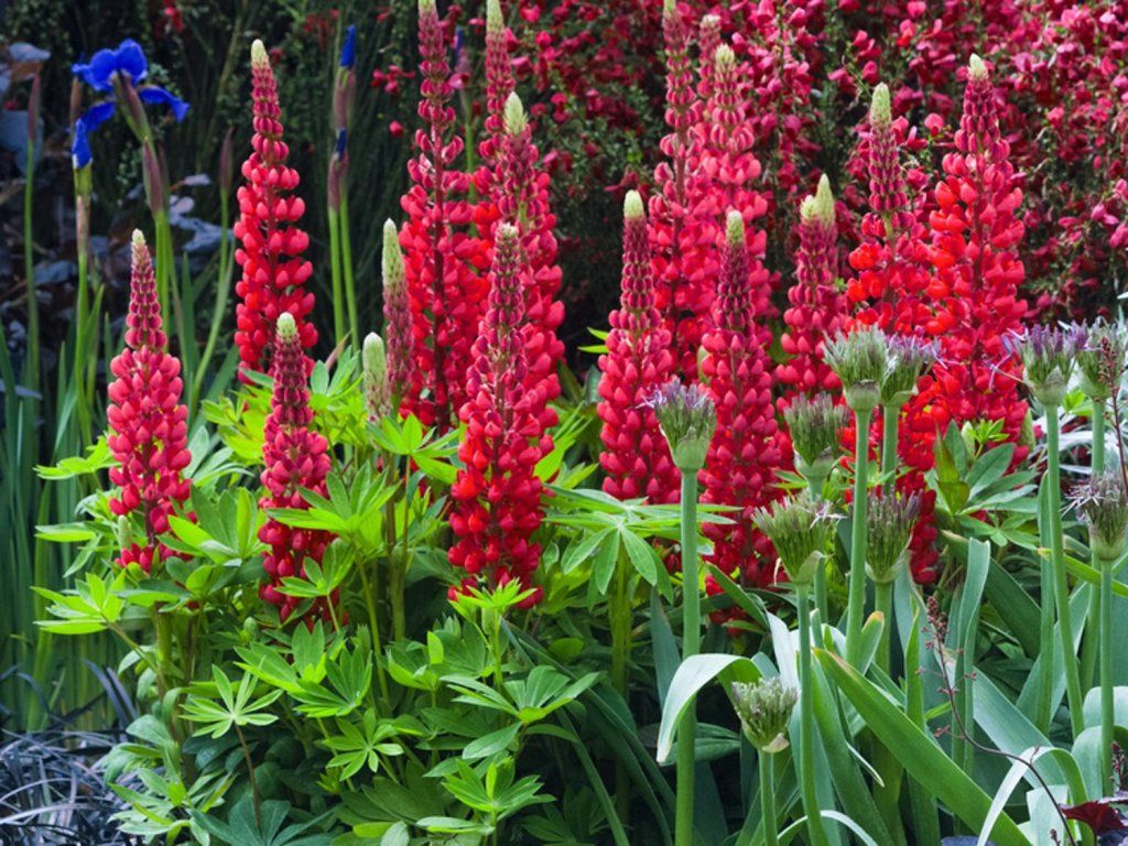 Lupina Nanus Russell 'Gallery Rot' - gehört zur kompakten Serie Gallery, die 1984 von der Samenfirma Tézier eingeführt wurde. Im Garten wird sie als kurzlebige Staude mit festem, horstbildendem Habitus kultiviert. Ausgewachsen erreicht sie meist eine Höhe von 40–60 cm in Blüte und 30–40 cm in der Breite, in den ersten Jahren bildet sie auffallend dichte Horste. Die Blätter sind handförmig gefiedert, mittelgrün, auf der Unterseite fein behaart und wirken auch außerhalb der Blütezeit dekorativ. Von Juni bis Juli ragen über dem Laub feste Stängel mit etwa 20–25 cm langen Ähren empor, die aus schmetterlingsförmigen, zart duftenden Blüten in tiefroter Farbe bestehen. Bienen und Hummeln nutzen die Blüten als reichhaltige Quelle für Nektar und Pollen. Nach der Blüte bilden sich aufspringende Samenhülsen; bei Pflanzungen in freier Landschaft ist es ratsam, die Selbstaussaat einzudämmen. Die Wurzeln leben in Symbiose mit Knöllchenbakterien, sodass die Pflanze Luftstickstoff binden kann und auf leichteren Böden oft ohne intensive Düngung auskommt. Die gesamte Pflanze ist beim Verzehr giftig und eignet sich daher nicht für Pflanzungen, bei denen Pflanzen üblicherweise probiert werden oder wo Haustiere verkehren. In der Komposition harmoniert sie mit Margeriten, Salbei, Margeriten, Schafgarben und Ziergräsern, wo die roten Ähren dem Beet einen klaren Rhythmus verleihen, insbesondere neben silbrigen Blättern und Gräsern. Sie hat einen kompakten Wuchs, was sie für die Vorderseite von Beeten oder für die Kübelbepflanzung geeignet macht. Sie ist eine ausgezeichnete Wahl für Gärtner, die eine Staude mit attraktiven Blüten und kompaktem Wuchs suchen.